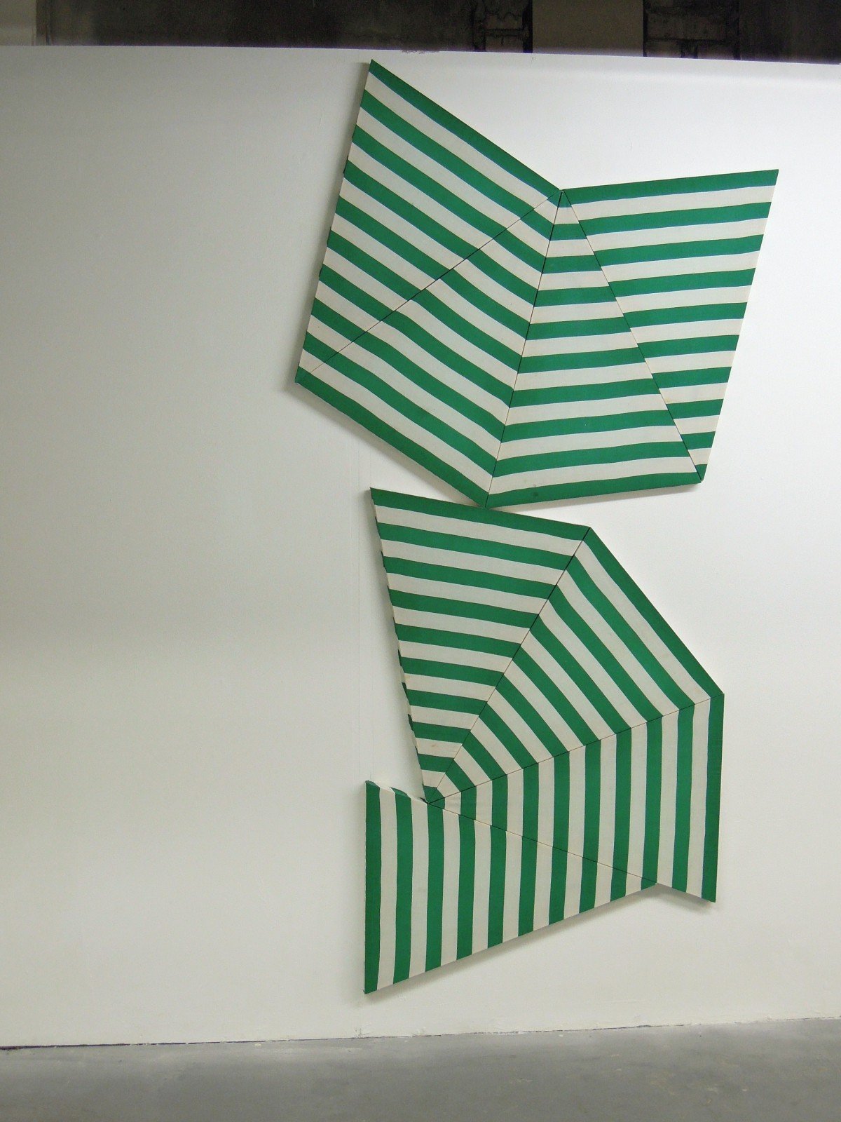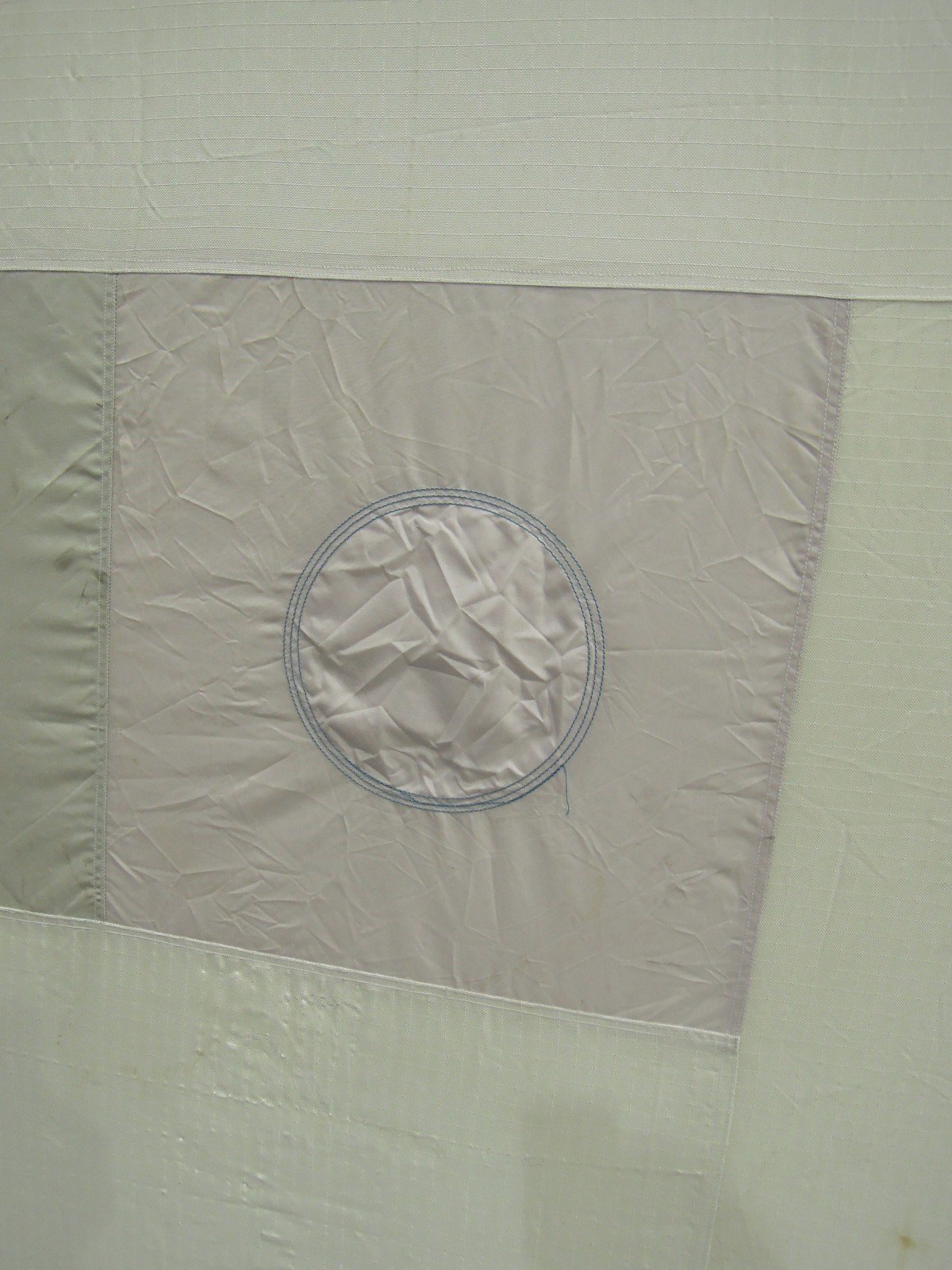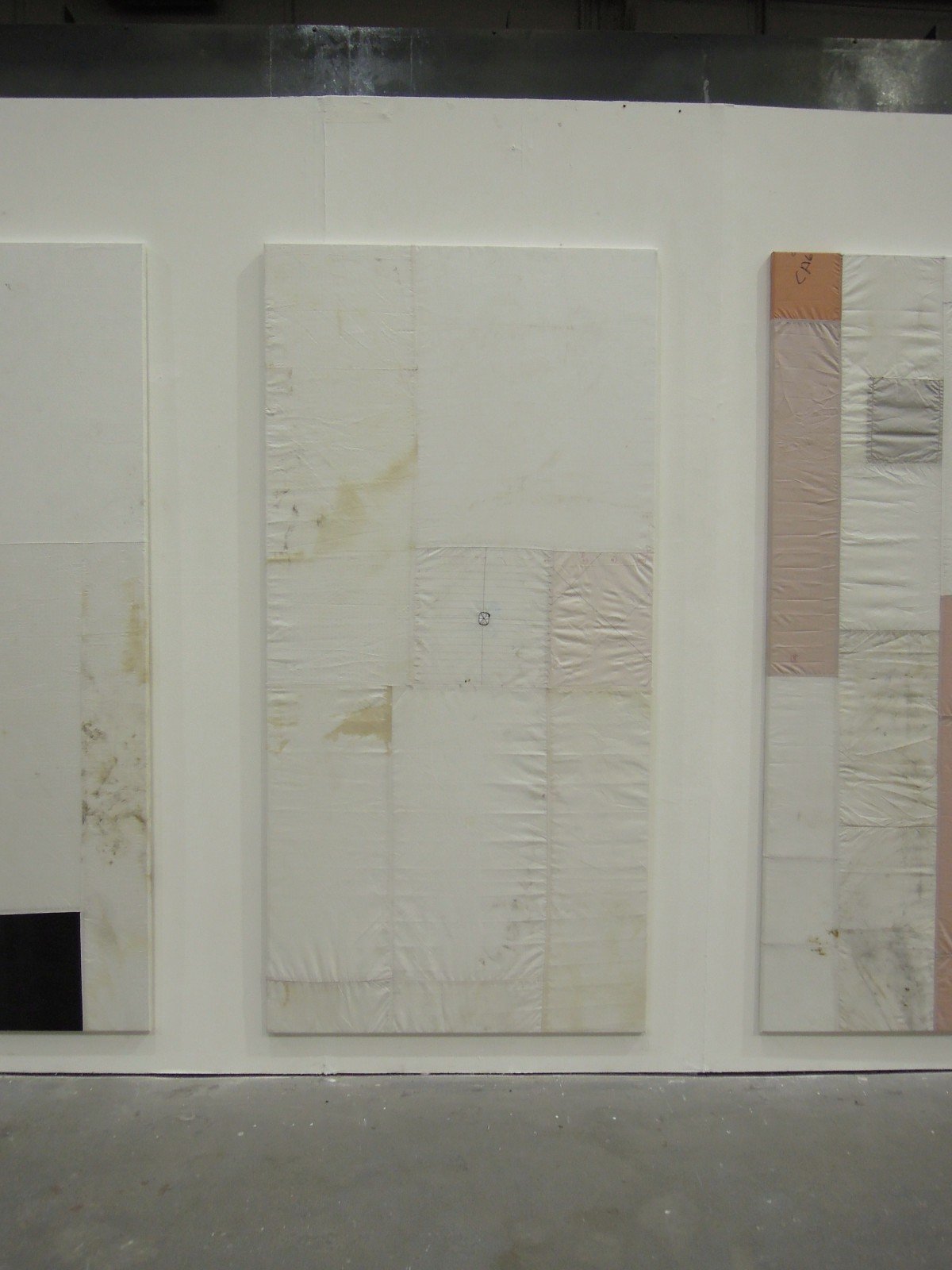 Ross Iannatti, born 1988, presents a series of two dimensional works titled “Hysteresis” made of stretched airbags extracted from abandoned cars and sewed in a patchwork formation. He is very young, keep an eye on him. All the three works on show are not available anymore.