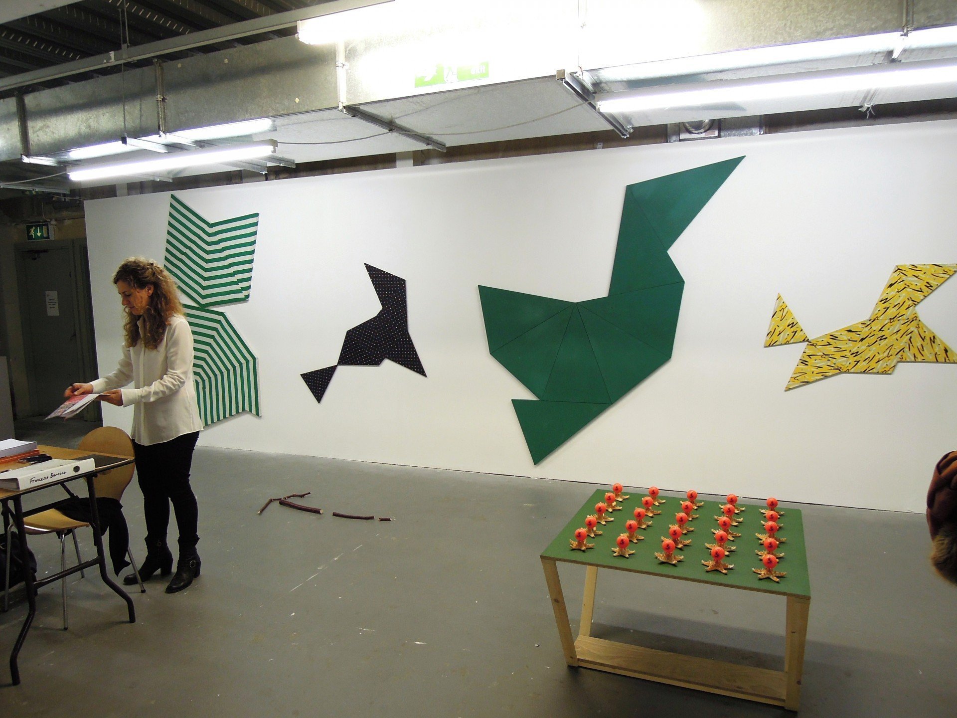Alek O. is born 1981, Buenos Aires. She presents two dimensional silhouette made of fabric taken from umbrellas and parasols. Probably they are not masterpieces, but the process of the making perfectly works as a conceptual frame.