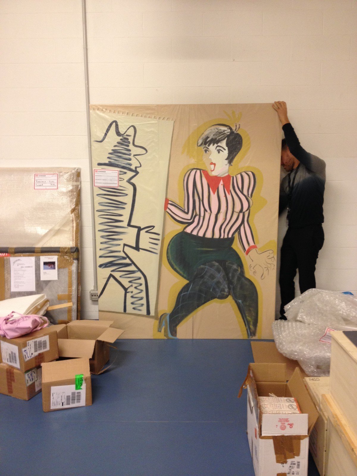 This photo was taken a few days ago in Turin, inside the storage of Artissima. The guy who is unwrapping this painting by Latvian artist Ella Kruglyanskaya involuntarily becomes an extension of the work, providing an unpredictable cluster of meanings. In effect, as the woman is putting her right hand behind the big sheet of paper on which an intimidating black man is sketched, the guy is behind the canvas, apparently looking for something. The cycle of art making are here perfectly represented: drawing (the idea), painting (the execution), experiencing (the real object).