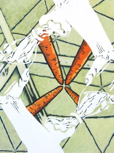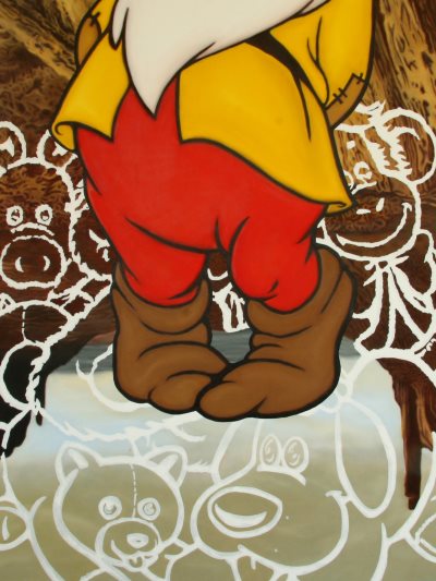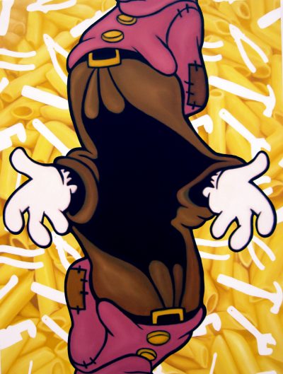 In the realm of the two-dimensional art Mudry’s references taken from comics and cartoons perfectly fit with a new trend that includes, for example, artists as Ella Kruglyanskaya and Oliver Osborne. Nowadays the images of artworks are circulating mostly thanks to the world wide web and this “synthetic” use of the line is definitely a powerful source, possibly an alternative one to the not-iconic art mass production of the last years. Moreover, he is experimenting the multi layers images, in a way that may recall, for instance, the Jeff Koons’ paintings of the last decade: to bring ahead this approach is a ambitious challenge, good luck!
