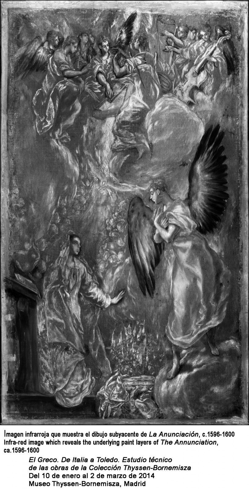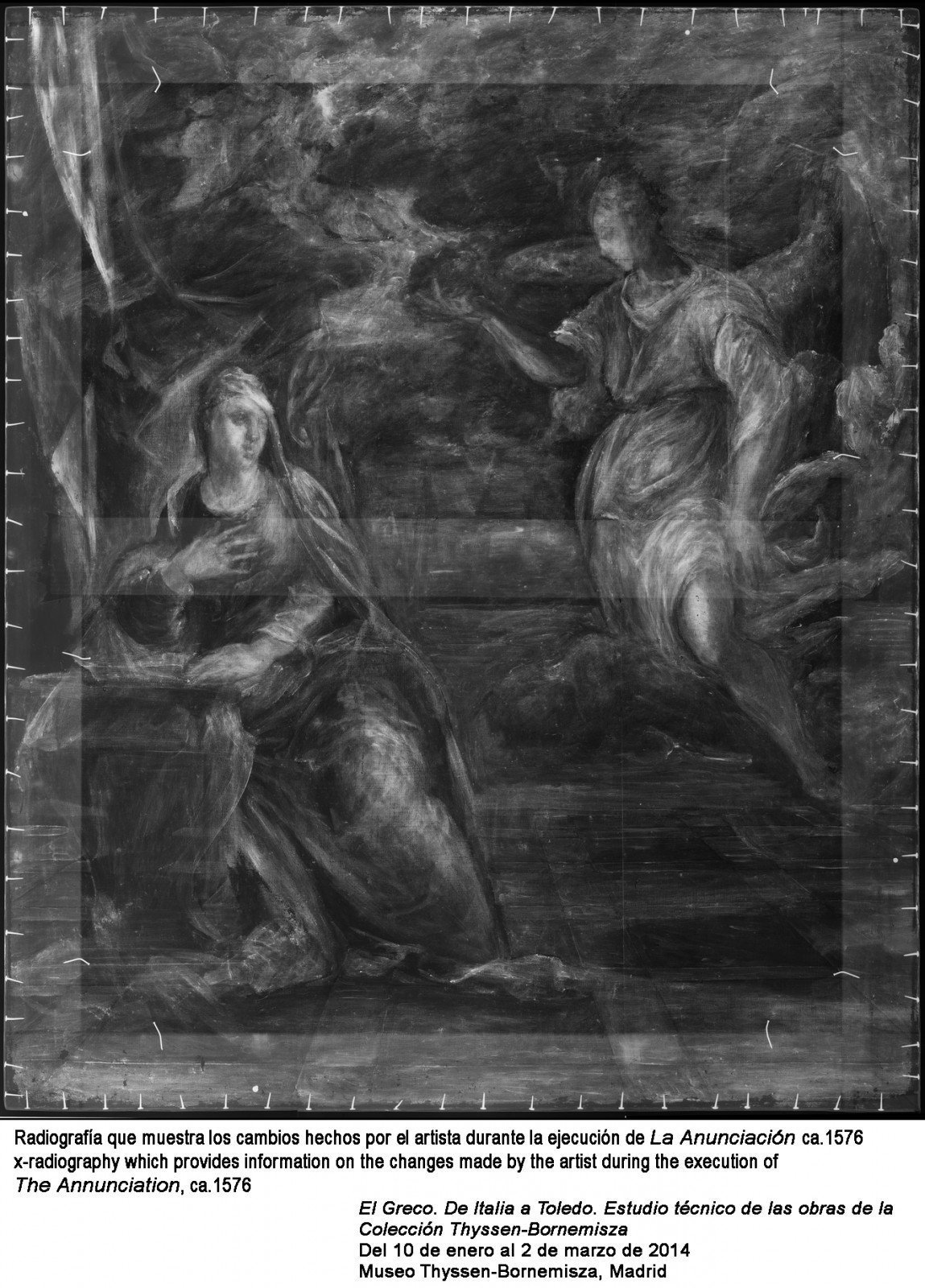 To mark the 400th anniversary of the death of El Greco, the Museo Thyssen-Bornemisza is holding the exhibition “El Greco. From Italy to Toledo” until March, 2 (free entry). It presents the results of the technical studies undertaken by the Museum’s Restoration Department on four works by the artist in the Permanent Collection: The Annunciation, ca.1576; Christ embracing the Cross, ca.1587-1596; The Annunciation, ca.1596-1600; and The Immaculate Conception, ca.1608-1614. Studying paintings from different periods of the artist’s career, and painted in different places, represents an outstanding opportunity for an in-depth analysis of El Greco’s technical and conceptual evolution during two notably contrasting periods of his life, separated by a period of approximately two decades.