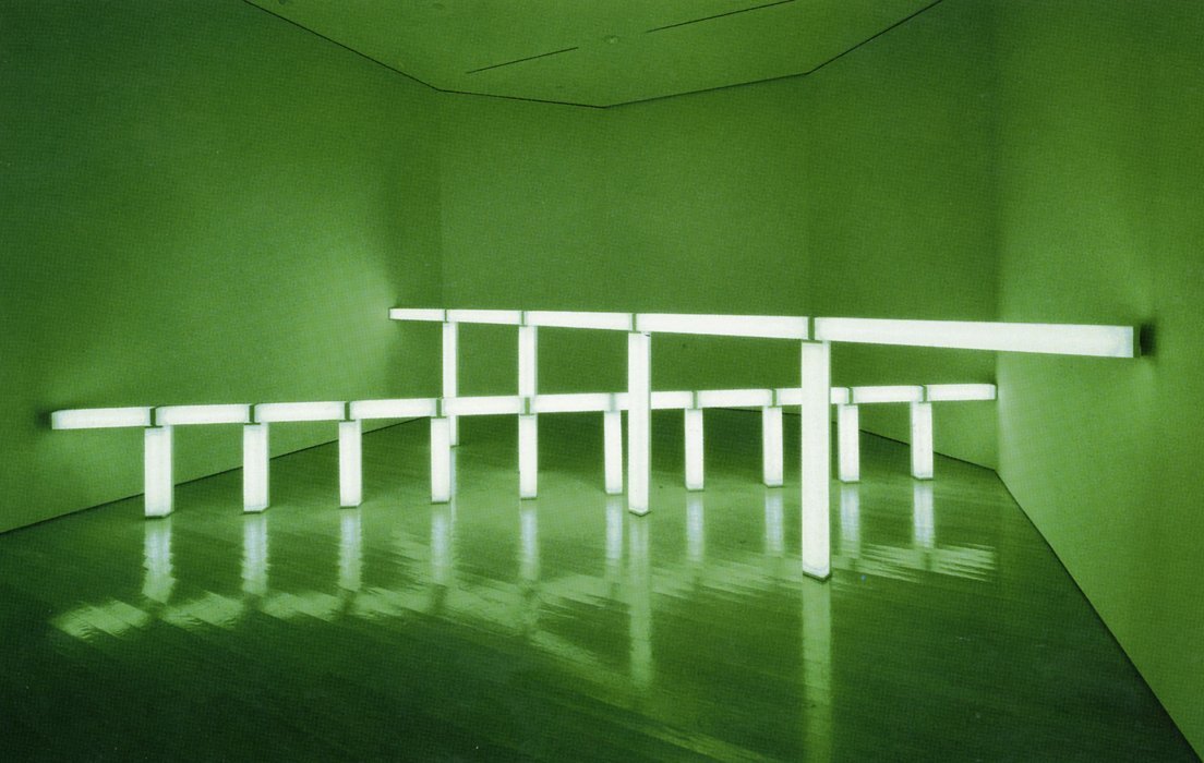 - Dan Flavin, greens crossing greens (to Piet Mondrian who lacked green), 1966. Green fluorescent light. First section: 4 ft. (122 cm) high, 20 ft. (609.6 cm) wide; second section: 2 ft. (61 cm) high, 22 ft. (670 cm) wide. Photo courtesy of Stephen Flavin © 2009 Stephen Flavin/Artists Rights Society (ARS), New York; courtesy of David Zwirner, New York/London.