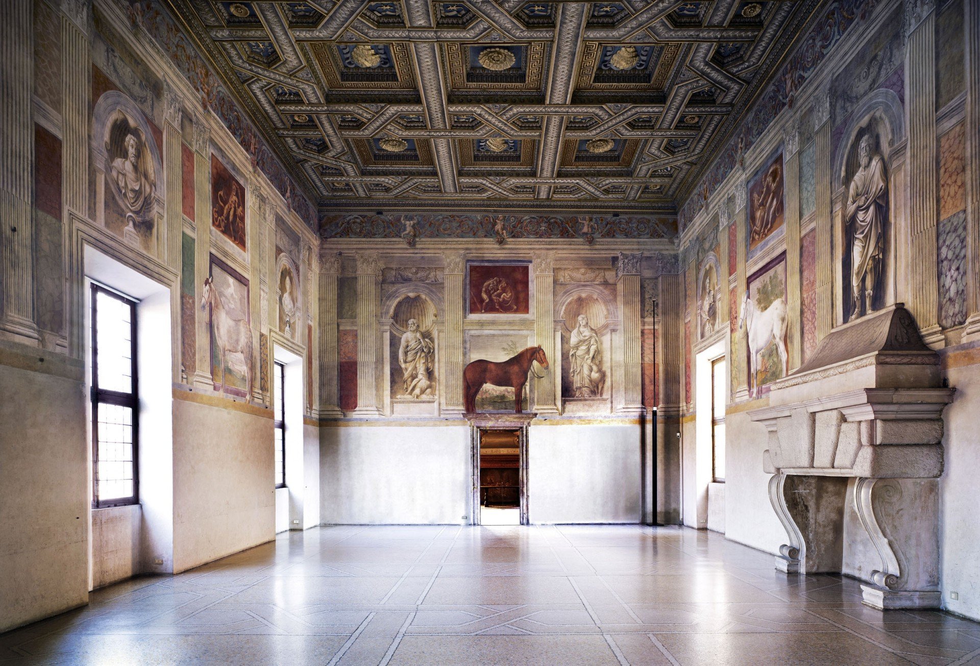 The frescoes, designed by Giulio Romano, has been realized mainly by Rinaldo Mantua. Originally, a floor made of pebbles river was connected to the painted stones at the base of the wall thus increasing the illusory effect of the whole (a remaining fragment can be seen in the photo by Höfer). The Chamber of the Giants may be regarded as a complete work, a synthesis of painting and architecture, a world that begins and ends in itself. Even today, a special acoustic phenomenon allows the transmission of voice, amplified, from a corner of the room to the opposite one. The work can be considered, as well as a masterpiece of Mannerism, also a site-specific avant la lettre.