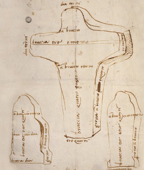 - Michelangelo Buonarroti, Sketches of marble blocks with a template for a crucifixion, sec. XVI, Florence, archives of the Casa Buonarroti Foundation