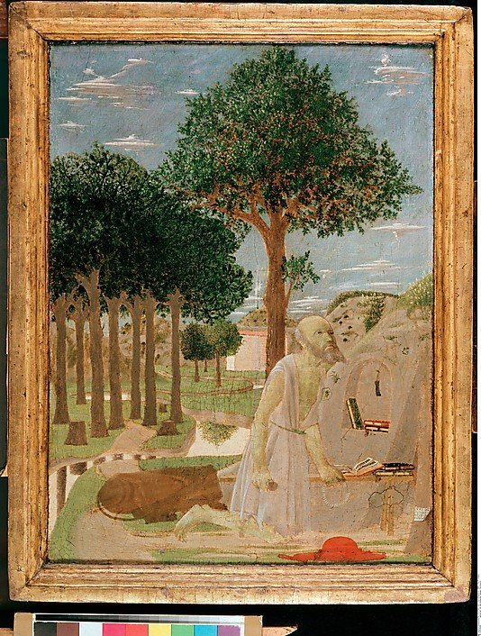- Piero della Francesca, “Saint Jerome in the Wilderness”, 1450, Tempera on wood, from Gemäldegalerie, Staatliche Museen zu Berlin