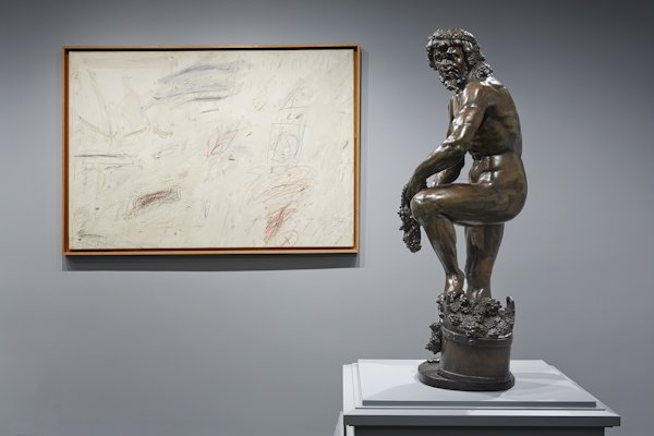 - Installation view at The Frick Collection showing Adriaen de Vries’s, “Bacchic Man Wearing a Grotesque Mask” with Cy Twombly’s, “Untitled”, 1959, ©Cy Twombly Foundation, both works from the Collection of Mr. and Mrs. J. Tomilson Hill; photo: Michael Bodycomb