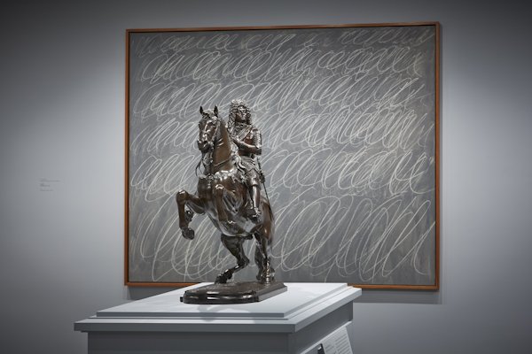 - Installation view at The Frick Collection showing Giuseppe Piamontini’s “Prince Ferdinando di Cosimo III on Horseback” with Cy Twombly’s “Untitled” (detail), “Chalkboard” series, 1970, ©Cy Twombly Foundation, both works from the Collection of Mr. and Mrs. J. Tomilson Hill; photo: Michael Bodycomb
