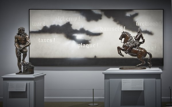 - Installation view at The Frick Collection showing Adriaen de Vries’s, Bacchic Man Wearing a Grotesque Mask and Giuseppe Piamontini’s “Prince Ferdinando di Cosimo III on Horseback” with Ed Ruscha’s, “Seventeenth Century”, © Ed Ruscha, both works from the Collection of Mr. and Mrs. J. Tomilson Hill; photo: Michael Bodycomb