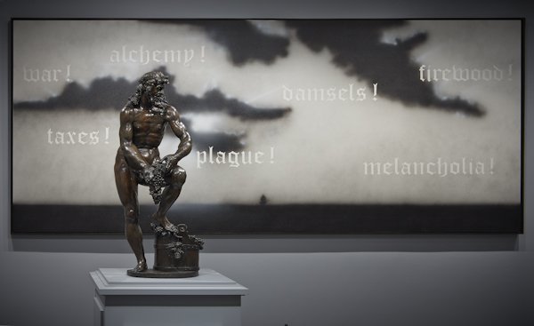 - Installation view at The Frick Collection showing Adriaen de Vries’s, “Bacchic Man Wearing a Grotesque Mask” with Ed Ruscha’s, “Seventeenth Century”, © Ed Ruscha, from the Collection of Mr. and Mrs. J. Tomilson Hill; photo: Michael Bodycomb