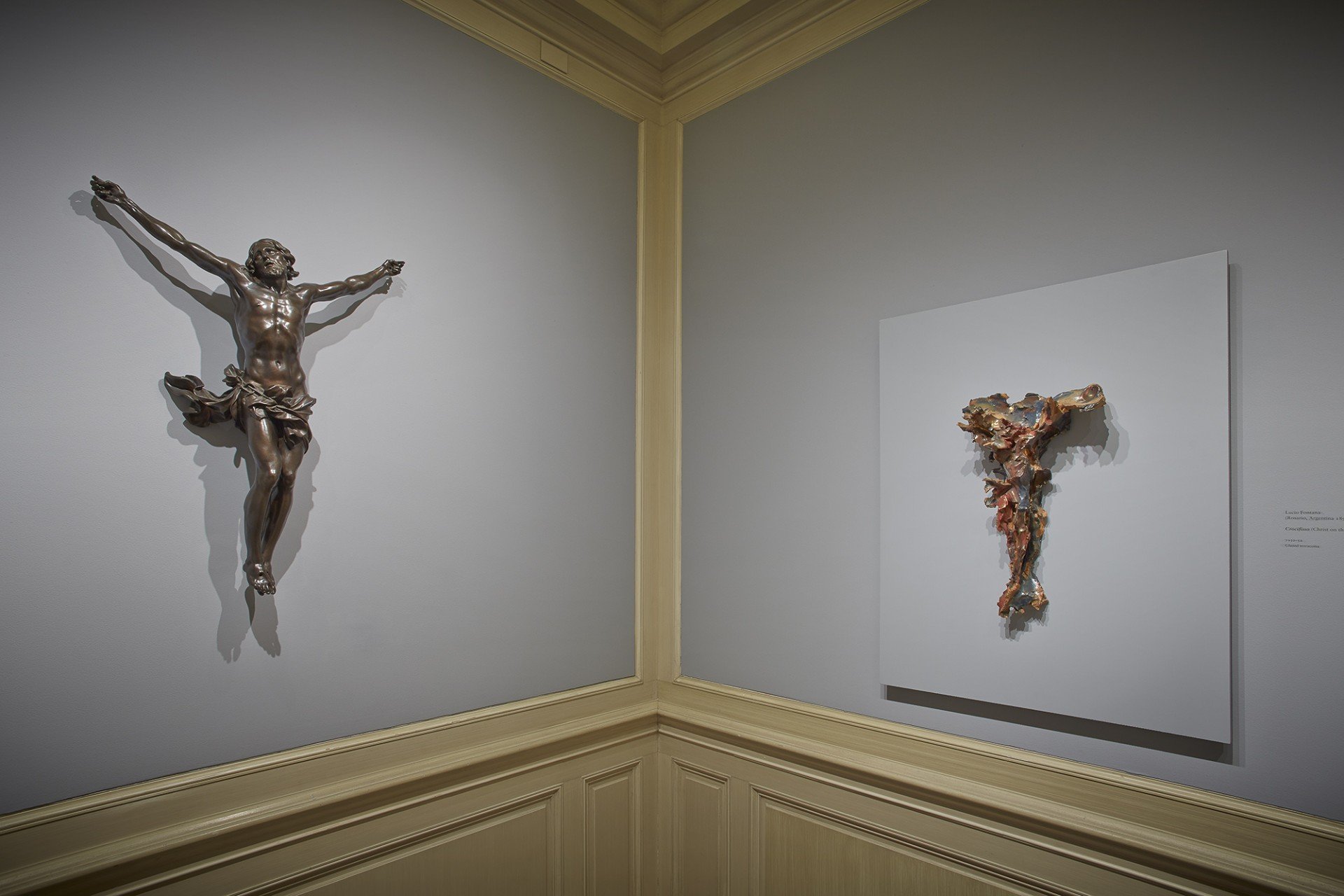 - Installation view showing a pairing in the Frick’s Cabinet gallery: Alessandro Algardi’s Cristo Vivo (“The Living Christ on the Cross”), juxtaposed with Lucio Fontana’s Crocifisso (“Christ on the Cross”), © Fondazione Lucio Fontana, Milan; photo: Michael Bodycomb