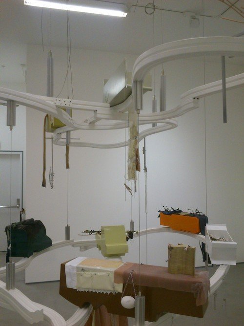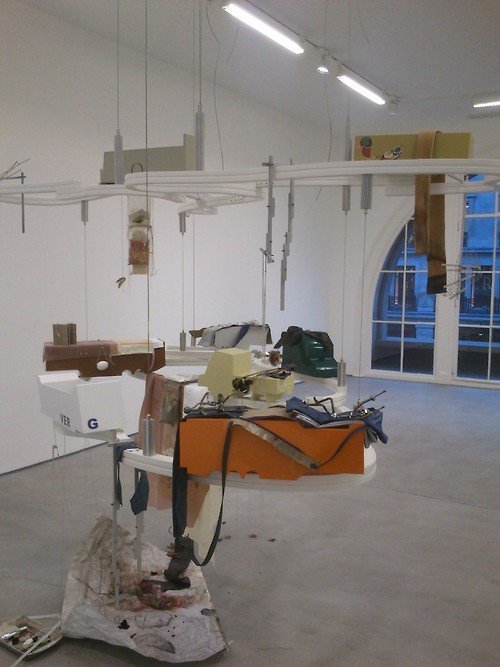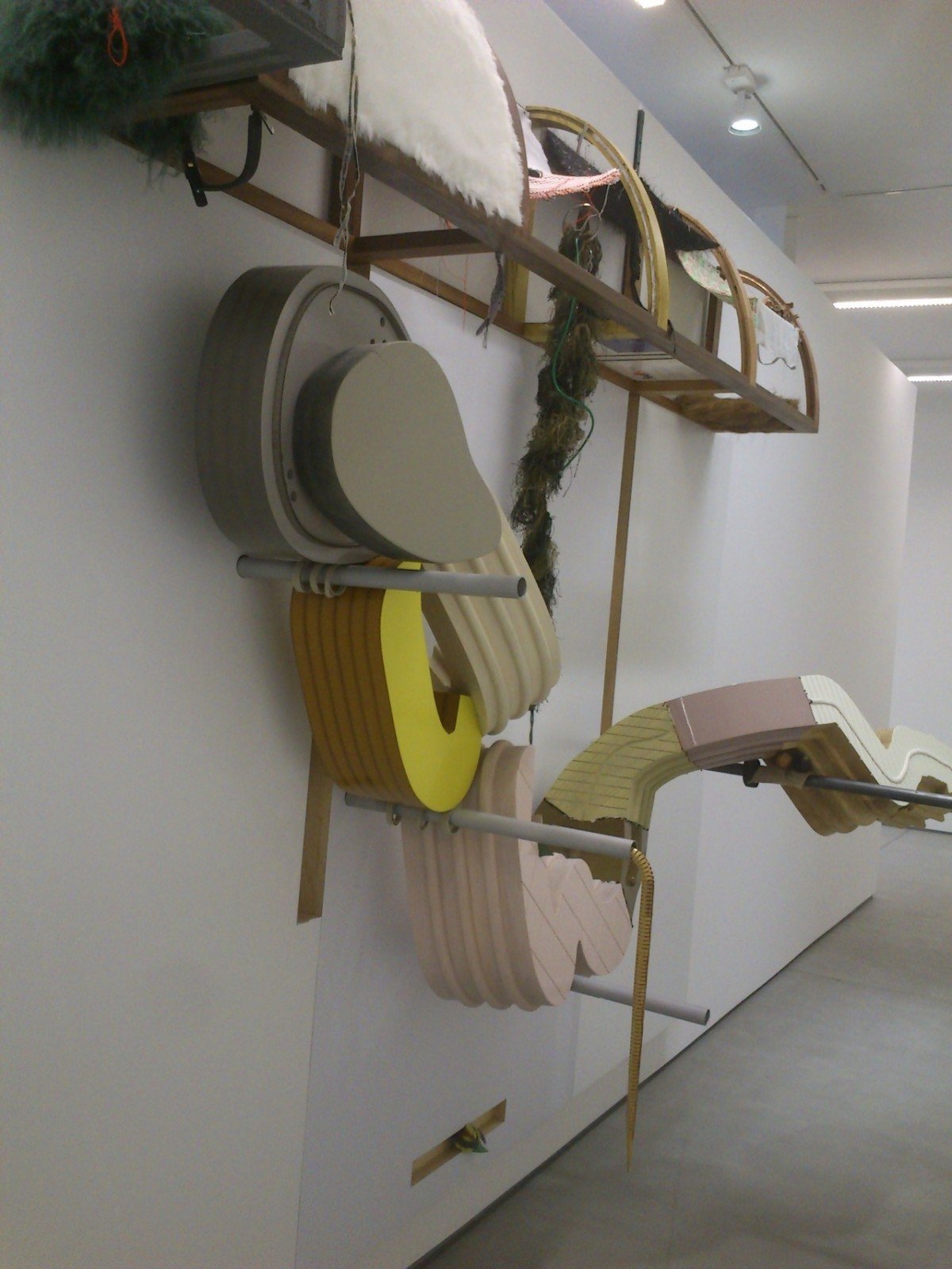 As demonstrated by the wordy press release provided by the gallery, as well as by the text that introduced Marten solo show at the Kunsthalle Zurich in 2012, it is very hard indeed to write about her lavish formal language. In her case probably the best thing a viewer can do is just to listen carefully to his own feelings and enjoy the chemical pleasure of sight, as he would do with installations by artists such as Franz Ackermann, Katharina Grosse or even Carol Bove.