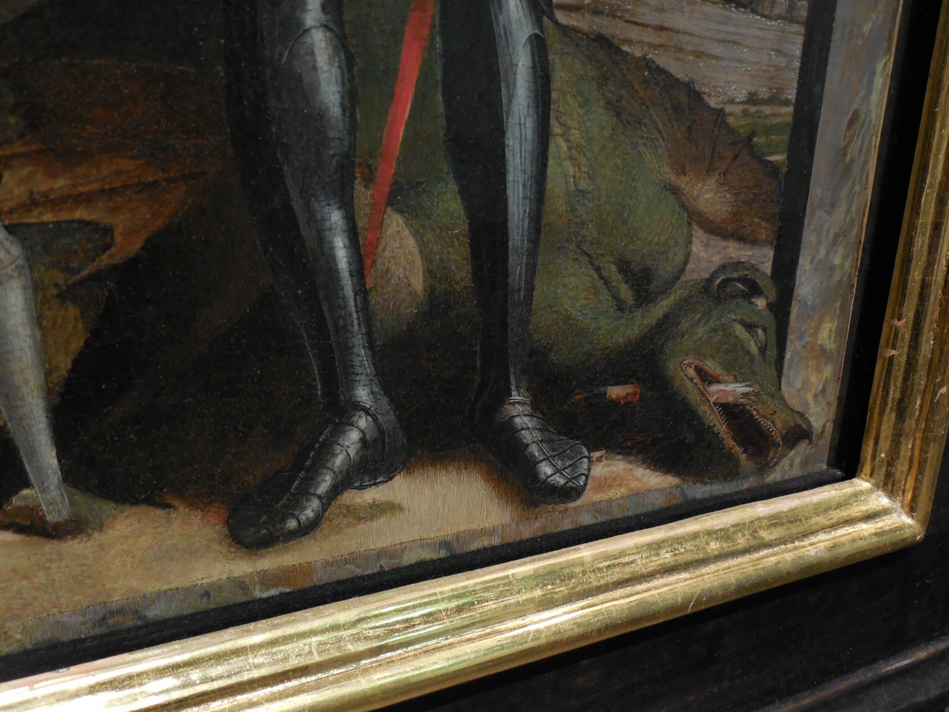 The painting depicts the dragon, now defeated and dead, grounded at the foot of the saint. The scene is enclosed within a painted frame (marble-like) and the landscape in the background is characterized by a realistic perspective. While the saint looks like he is posing for souvenir photos, similar to those of the hunters close to their prey, the dragon seems to come out from this frame, as to invade, with its muzzle, the space of the viewer.
