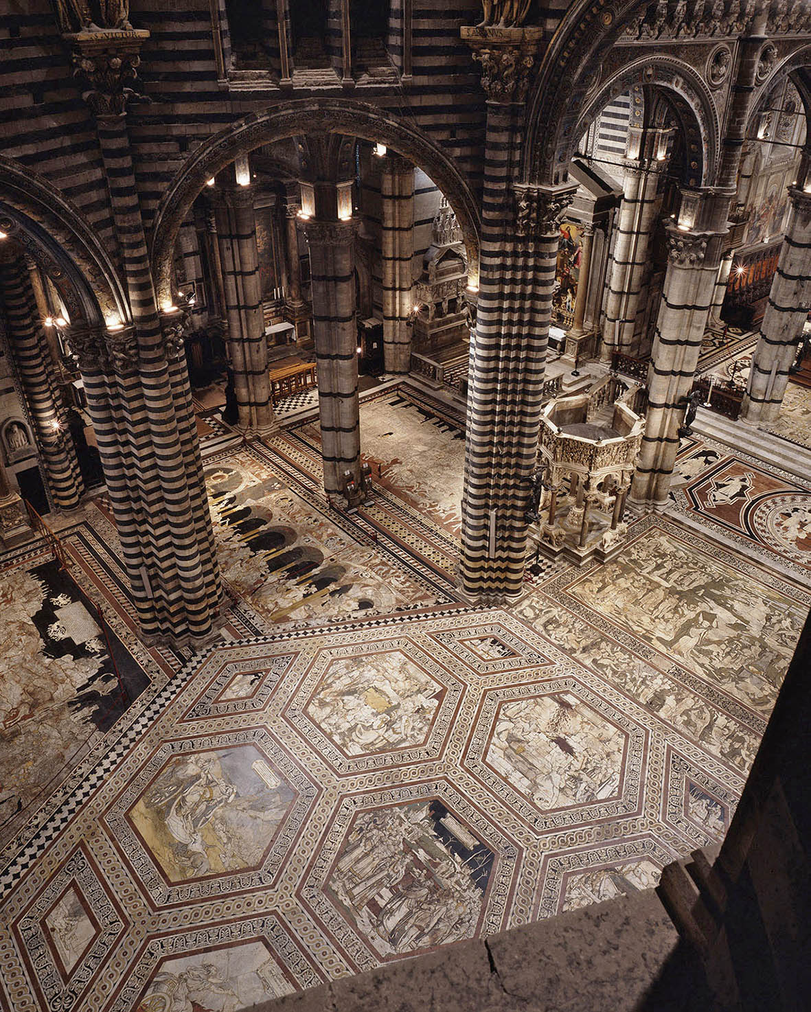 Above the starry vaults of the right aisle, there is the narrow passage reserved for small groups, accompanied by a guide. From there, the visitor will see the stained glass windows created by Ulisse De Matteis with the representation of the Apostles and will have the perfect view on the floor. It is one of the largest and finest examples of a complex of marble marquetry, a decorative project that lasted six centuries, from the fourteenth to the nineteenth century, whose designs were created by remarkable artists such as Sassetta, Pinturicchio, Domenico Beccafumi, and that according to Giorgio Vasari was the “most beautiful and greatest and magnificent floor that had never been done.”
