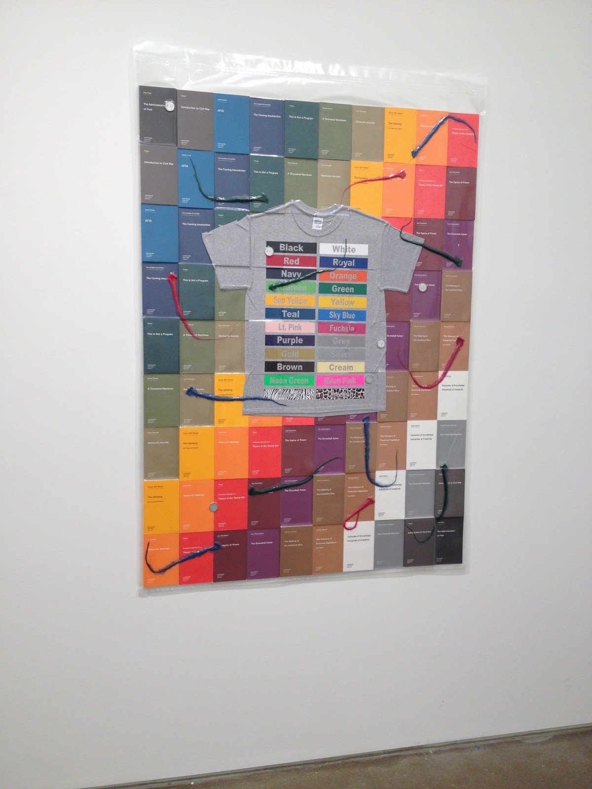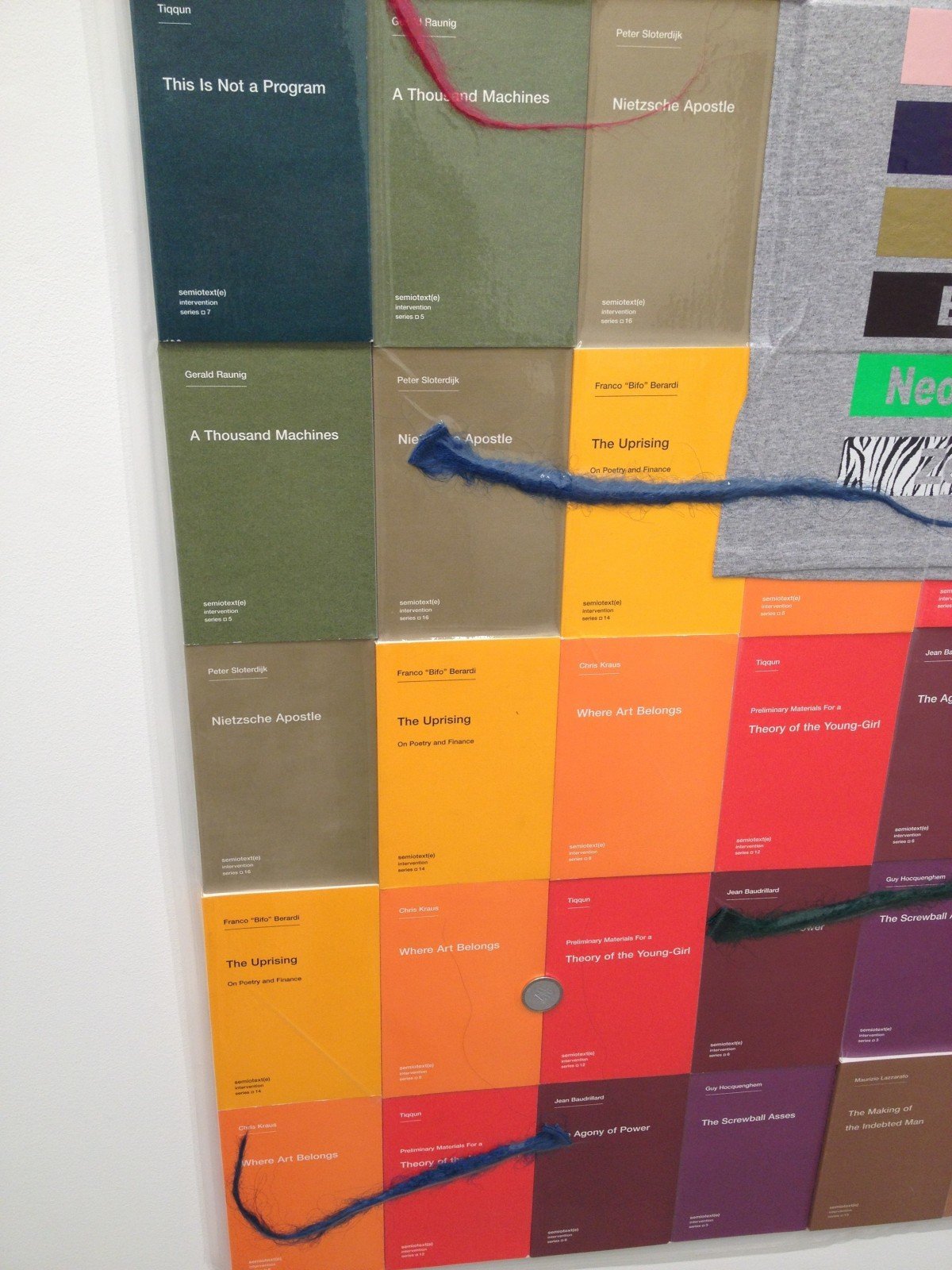 - Brad Troemel, 90 semiotics books, 2014, Semiotext(e) books, t-shirt, dredlocks, Litecoins, plastic bags, 175×118 cm.