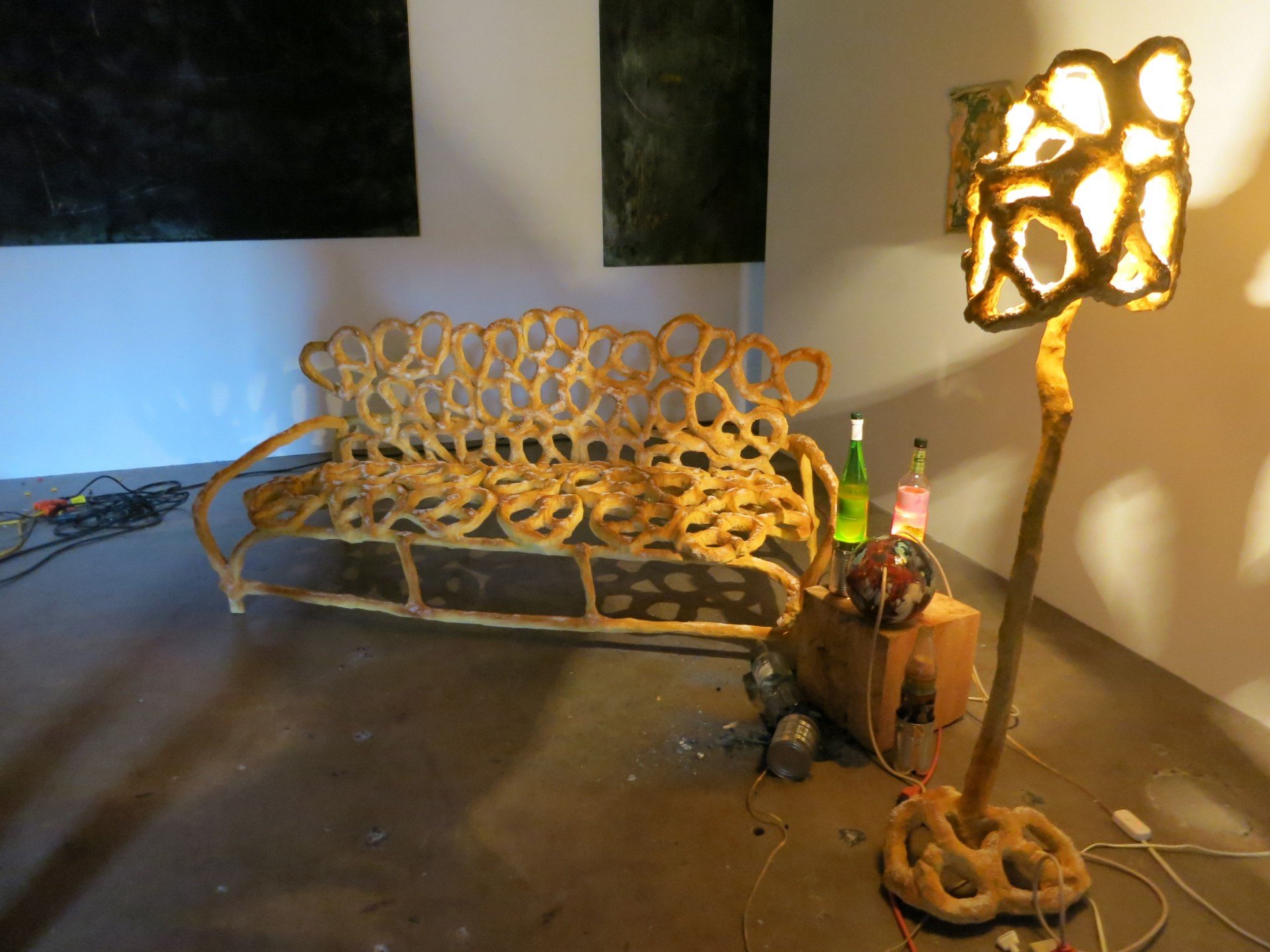 How many replicas of primordial assemblage, or ready made, or objects made of unconventional materials did we see in the last fifty years of art history? Could the step forward just be not a generic error, as stated by Thomas Bernhard (Old masters, 1985), but an error in the copying-fidelity? And then, is this the concept that moves Ahearn’s art practice of “self made” lava lamps, or pretzel made fornitures? It might as well be, if we consider the errors she disseminates everywhere all around her works.