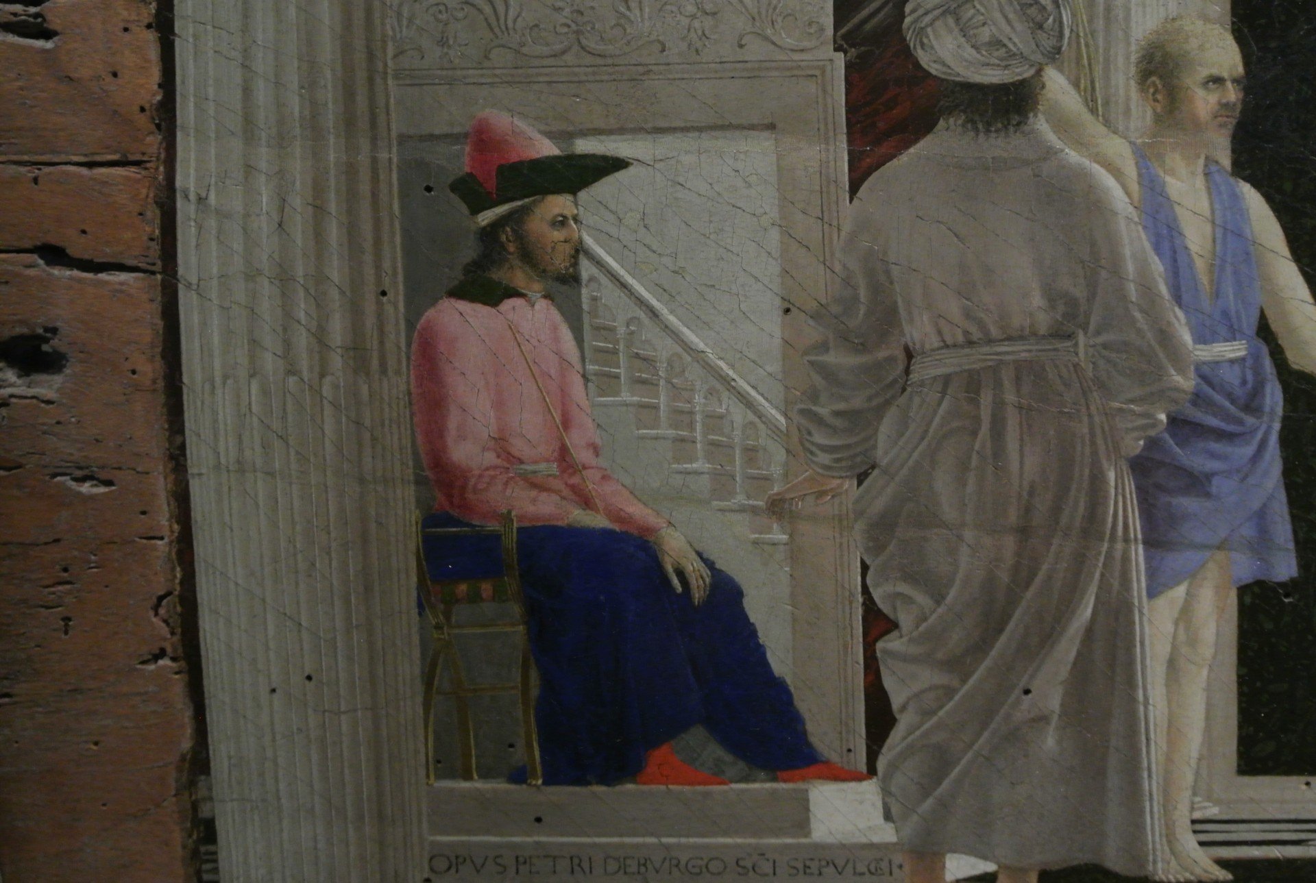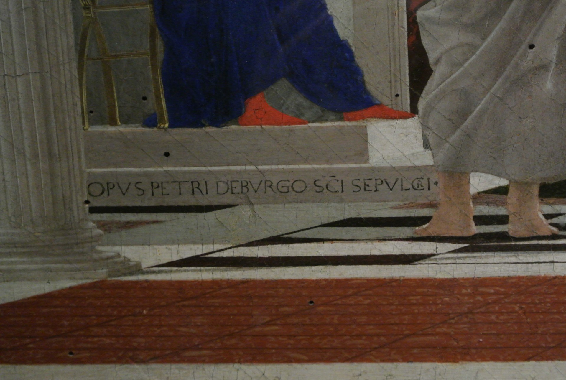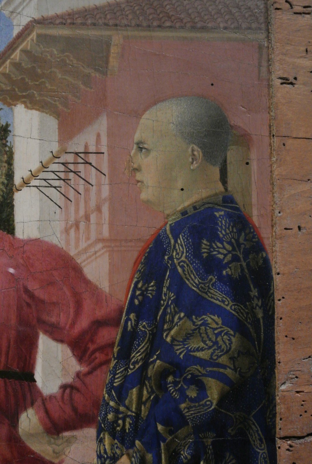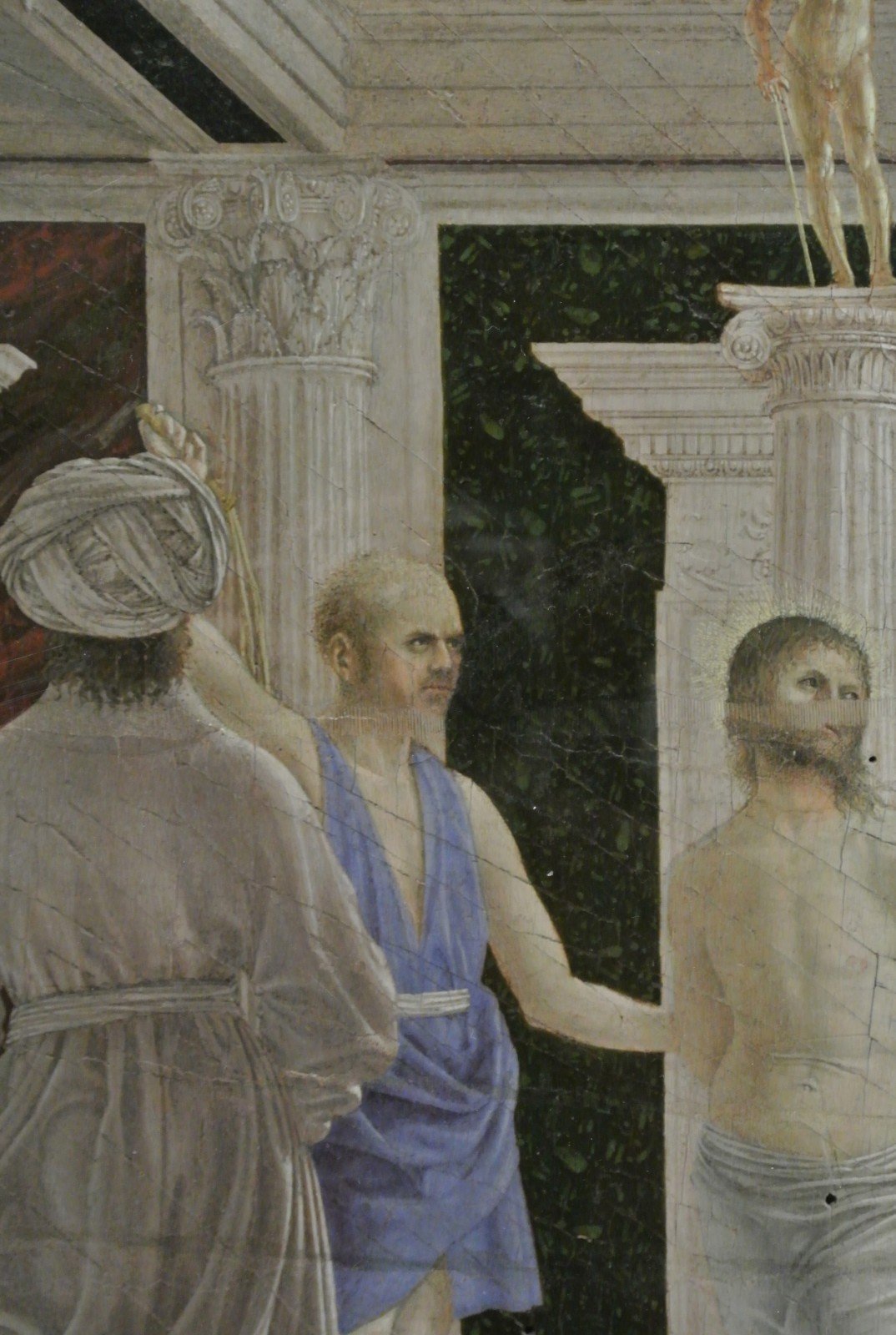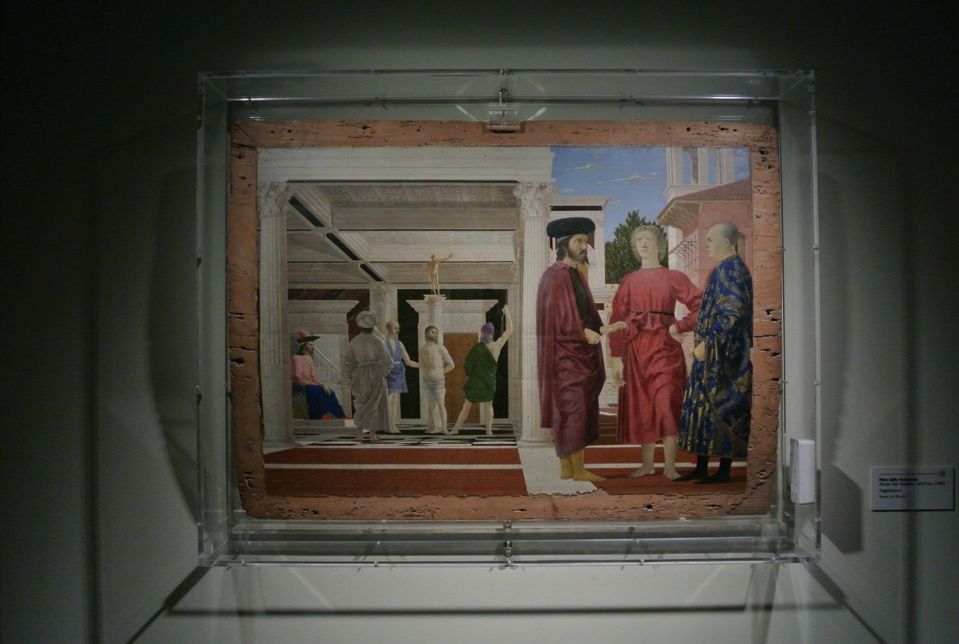 Even if jailed into a poor plexiglass box, and with a spotlight turning the screw on it, the “Flagellazione” doesn’t lose its impressive power. The image conceived by Piero is an extraordinary eye catcher, made of hidden places and obscure sides. Who is inside the buildings, up the stairs, behind the surface? What do the three characters on the right have in their pockets? Who is the mysterious man looking at Jesus suffering?