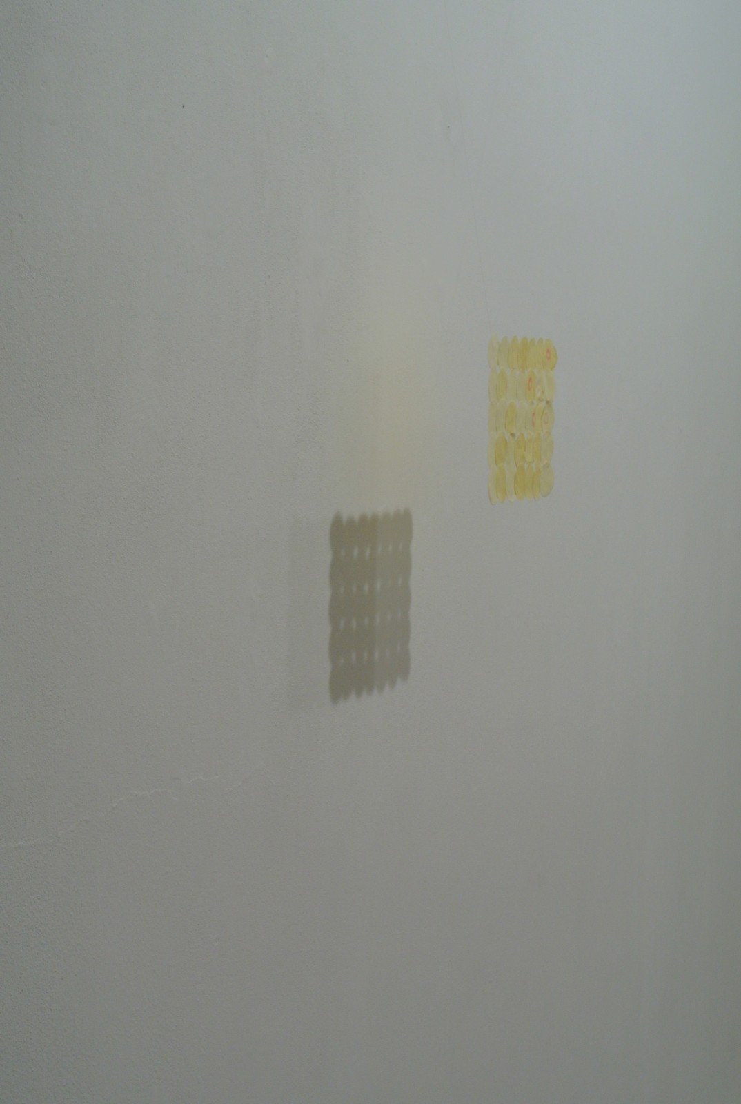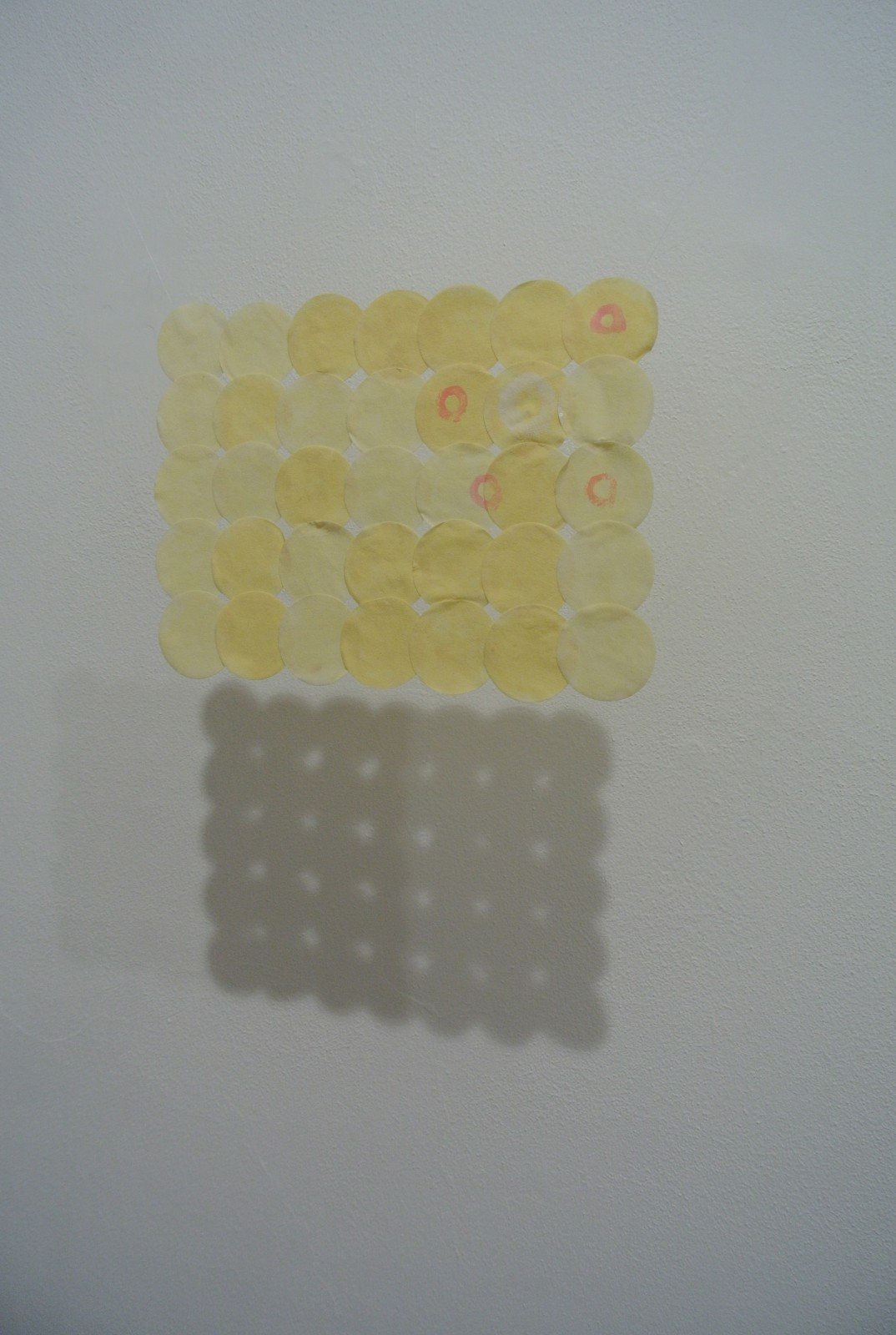 - Karla Black, Not Entirely, 2014. Nail pad hanging work. Cotton wool pads, nail varnish, thread, 22x29cm