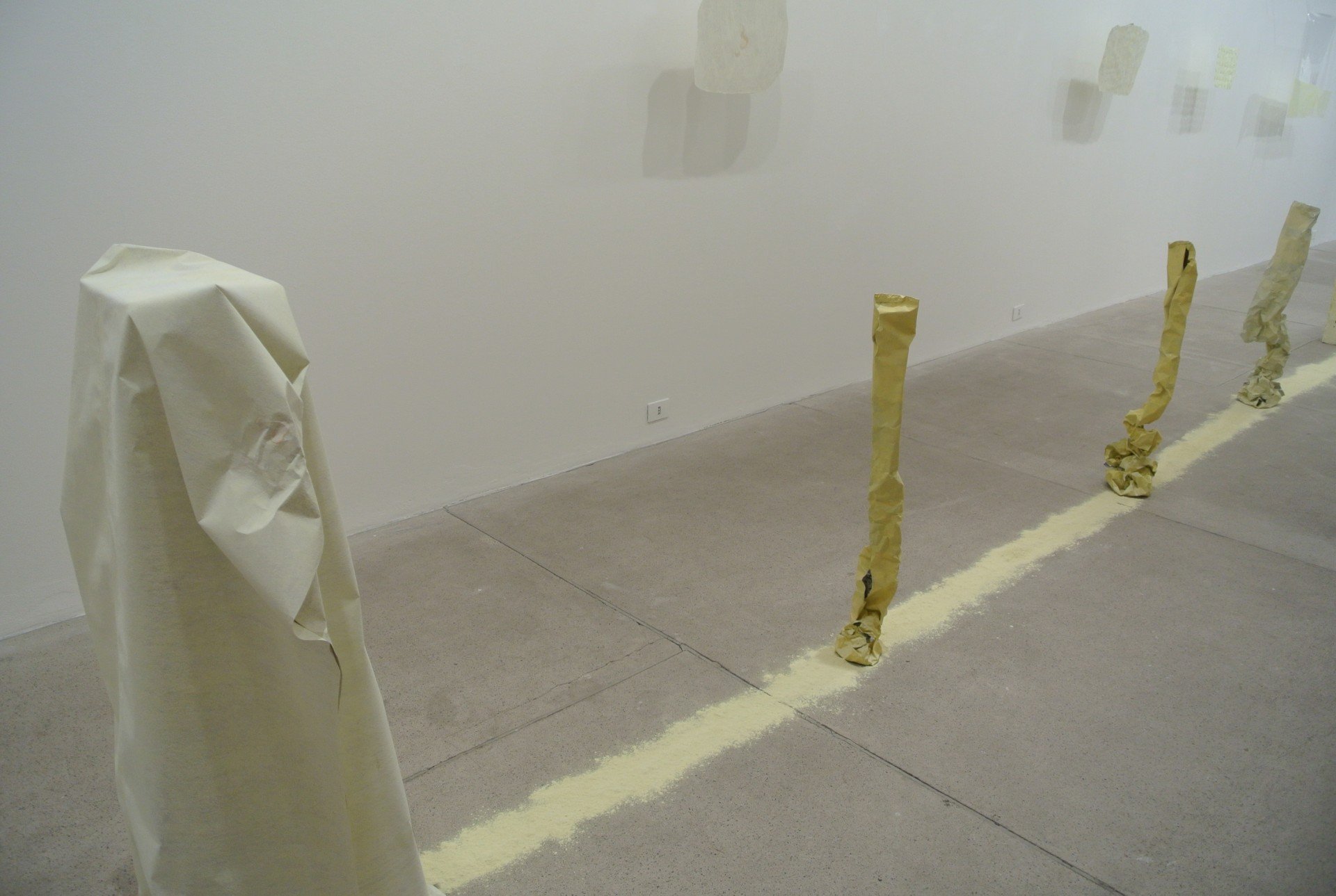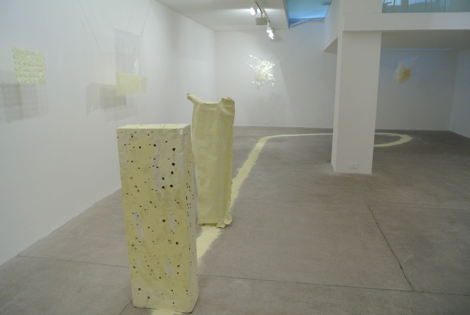 At the gallery, we have been told that the yellow pigment has been added by the artist’s assistants after the installation of the artworks. Therefore it should be considered as a sort of activator of the pieces on display, especially the three-dimensional ones put on the floor. Ms. Black didn’t come to install the show because she is pregnant and next to the due date – and the color she has chosen for this show doesn’t tell us whether the baby will be male or female…