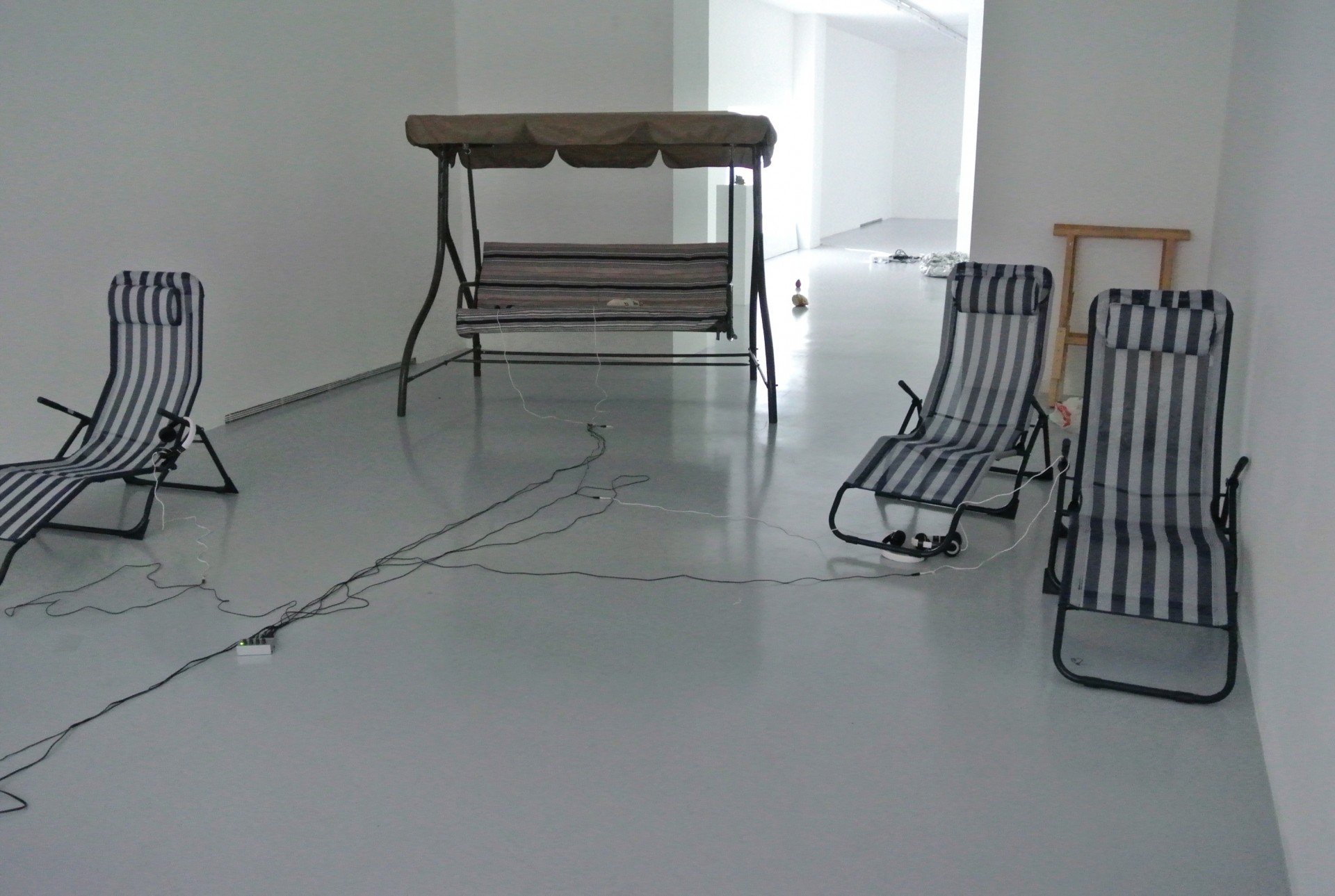 Probably the artist is aware that being alone in the jungle might be scary, therefore she takes care of her viewer. The long looping 3D video in which she acts with big glasses and a long black beard would be hard to be appreciated without the comfortable swing and the chairs kindly provided by the artist. The same is to said for the other two videos describing a sexy night battle with pillows and the exploration of a cavern. In this case video game seats are available for the vision.