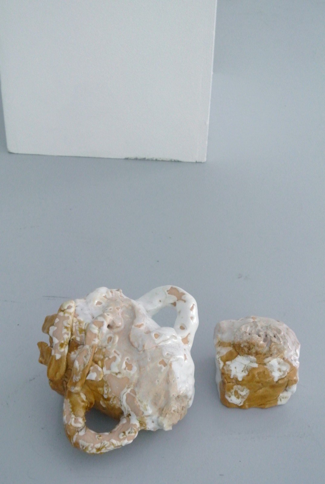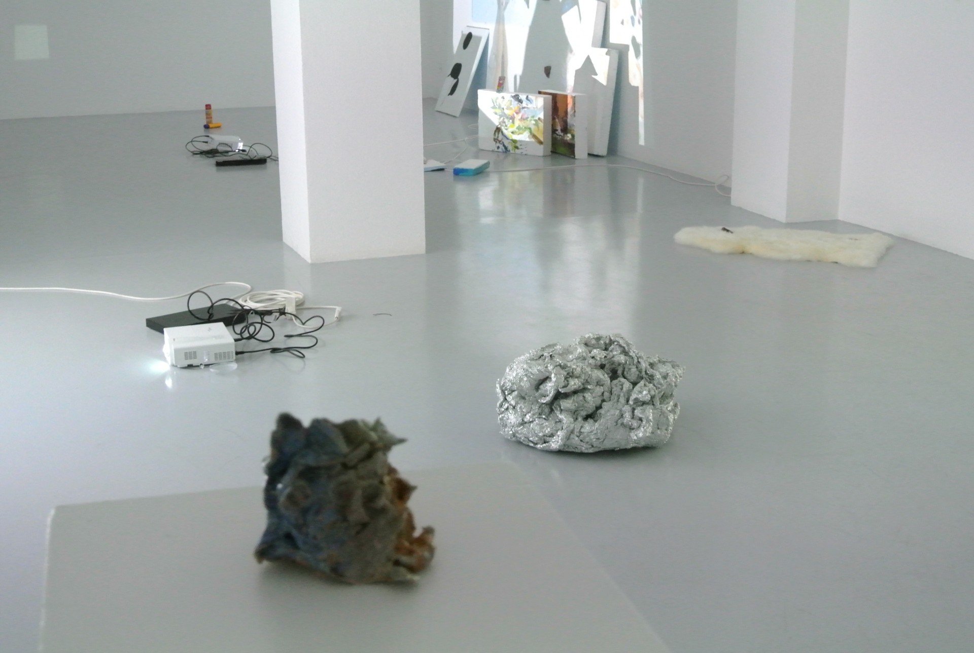 - Trisha Baga, Sand right outside my door, 2014, 3-D video projection on painted foam + installation. On floor: aluminium object, ca. 26x60x60 cm, 2 glazed ceramic objects, ca. 12x20x14 cm, and ca. 6,5x8x8 cm timer. Detail.