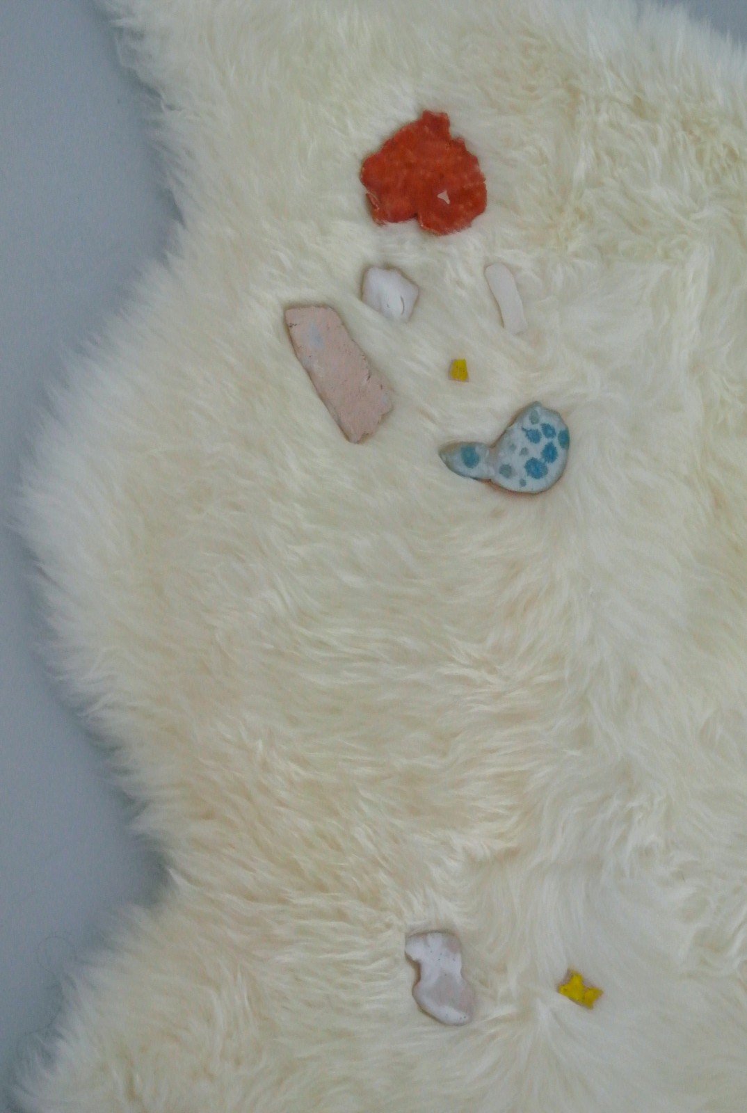 - Trisha Baga, Pizza POV, 2014, sculpture. On wall: 4 slices of salami. On floor: carpet with 9 glazed ceramic objects, Carpet: ca. 2 x 68 x 103 cm. Dimensions variable