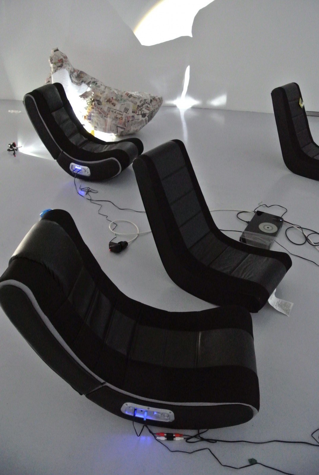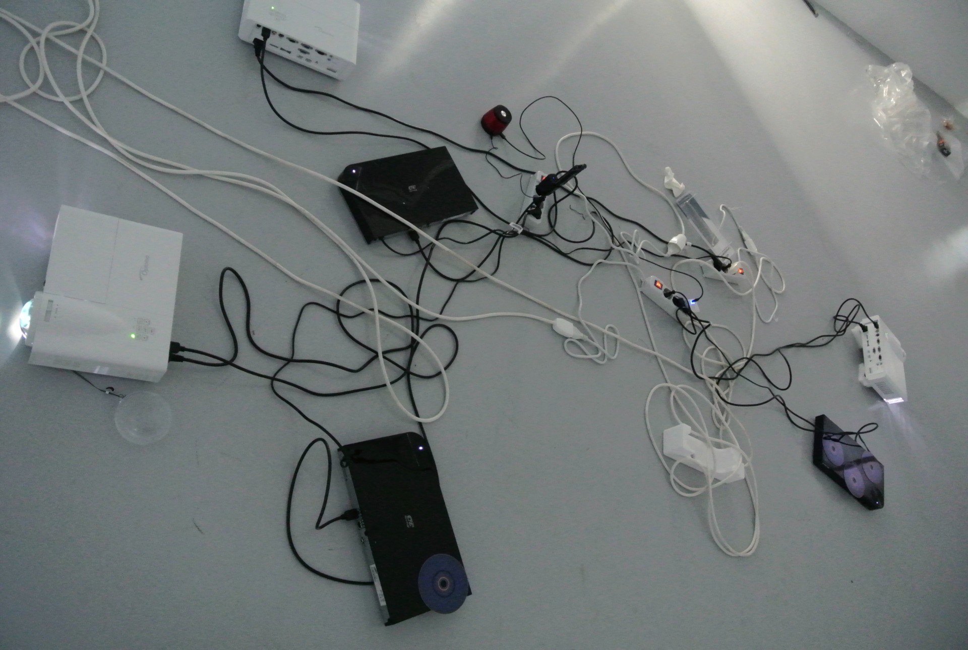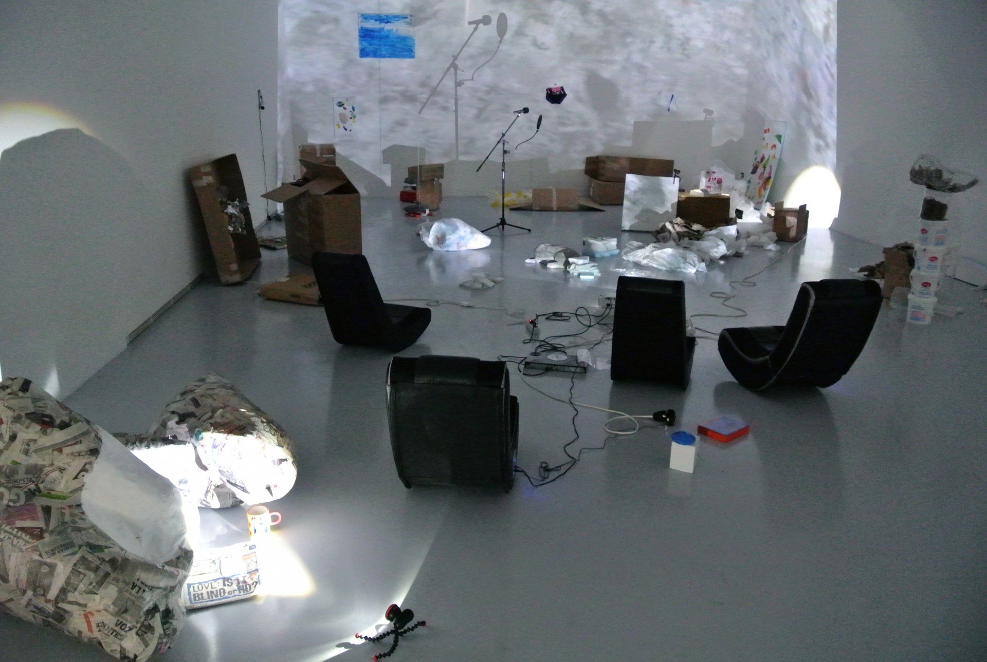 In this jungle of visual elements the 3D video projections are with no doubt the big plants, while the small ceramics are insects. Therefore the medium size objects – the beautiful irregular rug, the paintings, or the video game seats – could be the animals. The cold blu light of the projectors is the connective matter that keeps all these living creatures together.