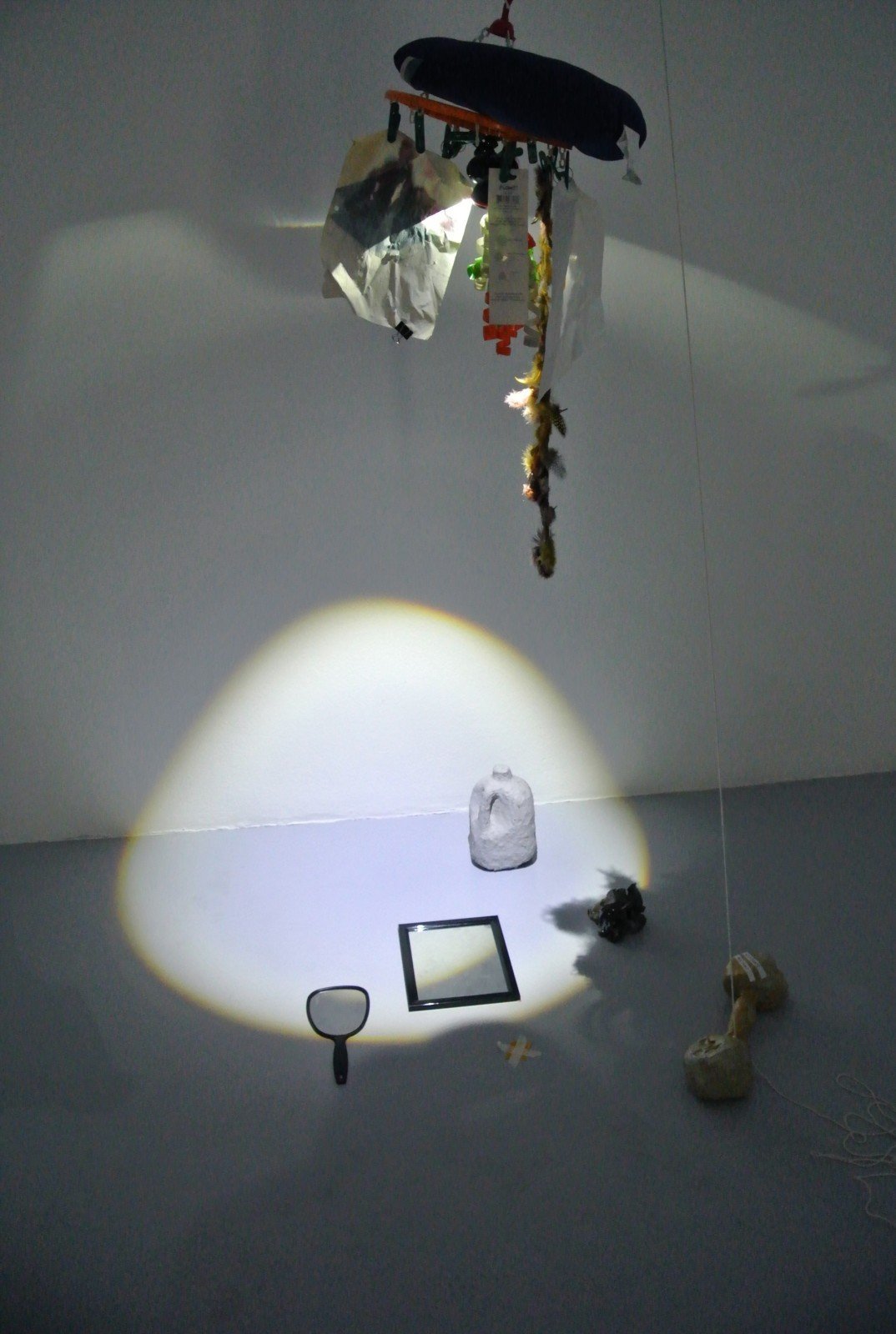 - Trisha Baga, Guano, 2014, sculpture. Hanging: Neck pillow, rotary clothes dryer + pegs, tape with feathers, various papers, spotlight, H. ca. 85 cm On floor: 1 papier maché milk carton, ca. 26x15x15 cm, 1 glazed ceramic bone, ca. 11x38x12,5 cm, 1 glazed ceramic object, ca. 11x12x11 cm, 2 mirrors Dimensions variable.