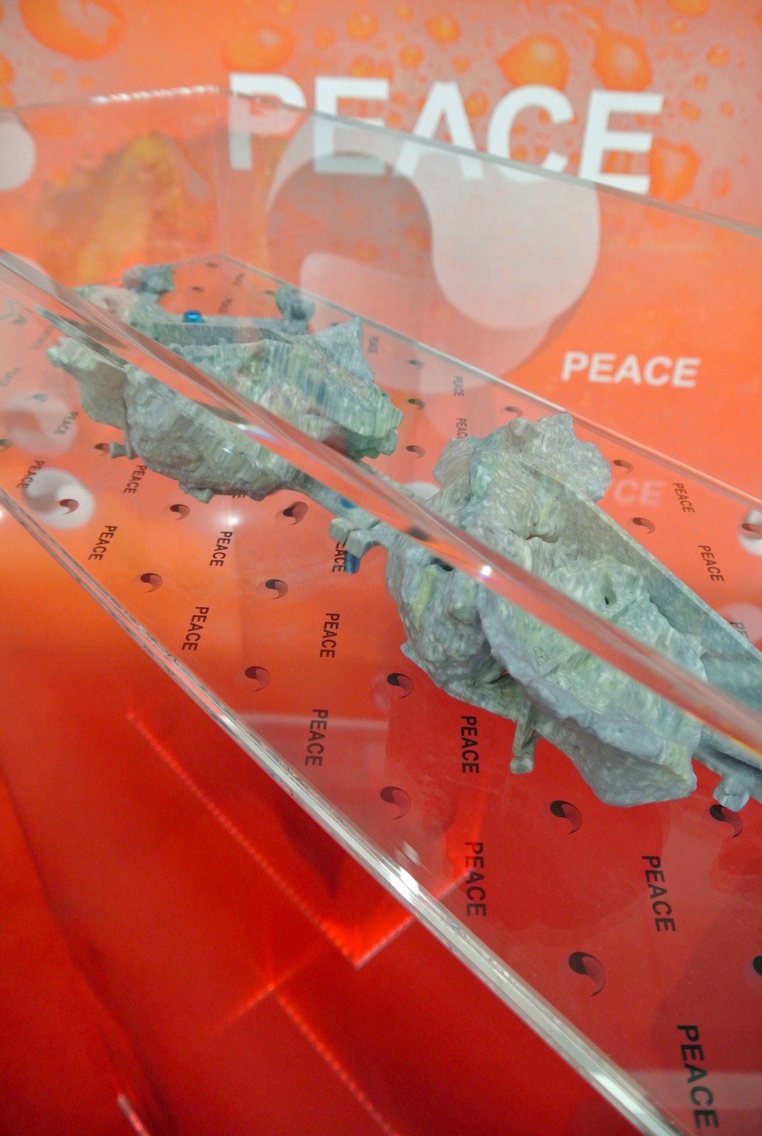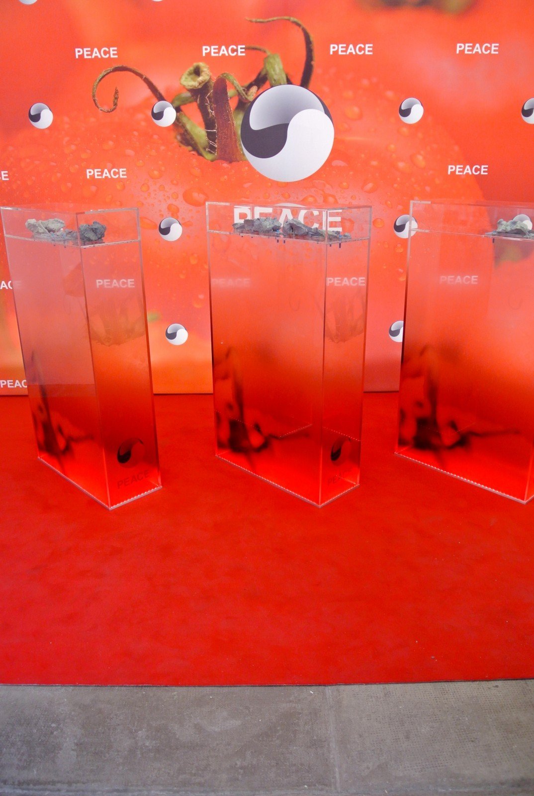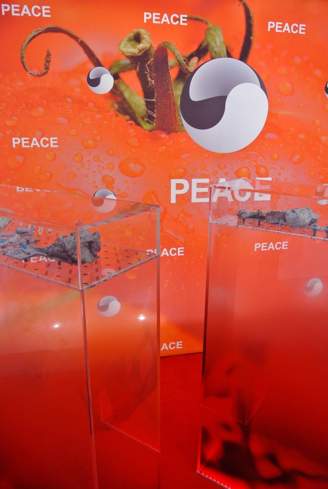 Elements: three vitrines containing 3D printed human bones and one large freestanding advertisement banner with tao symbols and the word “peace” printed over a close up image of a big red tomato. That is what you see, and also read in the artwork’s caption. But if you ask to the gallery – that is the good side of visiting art fairs! – they will tell you that the artist is trying to register both the tao logo and the word “peace”. This artistic gesture embodies the critic that Si-Qin is moving to the contemporary society.