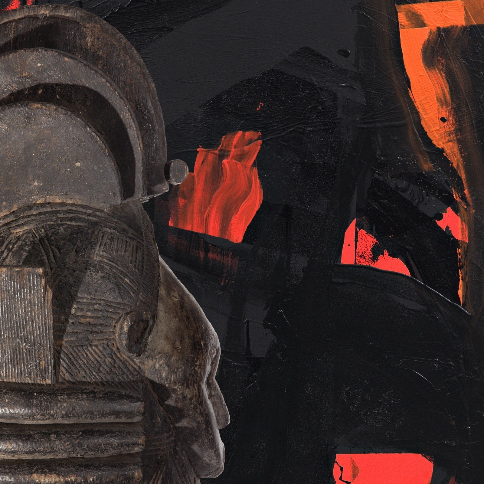 - Will Boone, SOLDIER, 2014. Acrylic and Enamel on canvas and Helmet Mask of the Sande Society, “Gonde”, Mende or Vai, Sierra Leone or Liberia. Courtesy Peres Projects, Berlin.