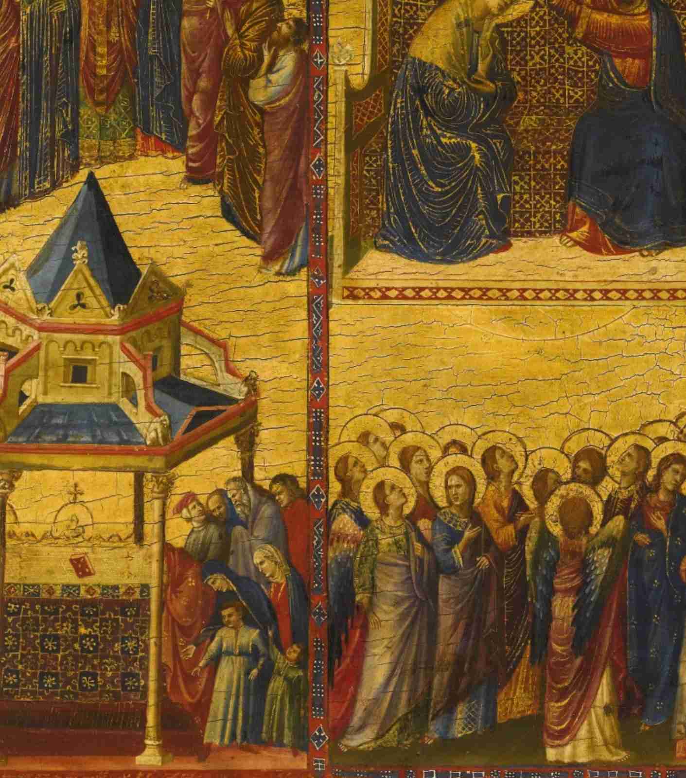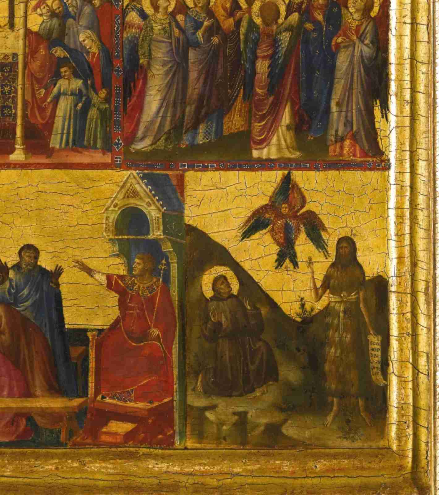 The comparison between this panel and the right side of the diptych – currently preserved at Palazzo Barberini in Rome, revels how the attention Giovanni pays to movement and space is – reinforced by the irregular partition of the scene of the first one. The red decorated strip that separates the Apotheosis of Saint Augustin from the Crowning of the Virgin and the circular group of angels and saints looking vividly at it doesn’t continue on the lower section, where the throne and the mountain create a sort of unique object. Moreover, the left side of the red horizontal strip has no decoration, and differs from the other horizontal line at the feet of the Holy Mary and Jesus Christ.