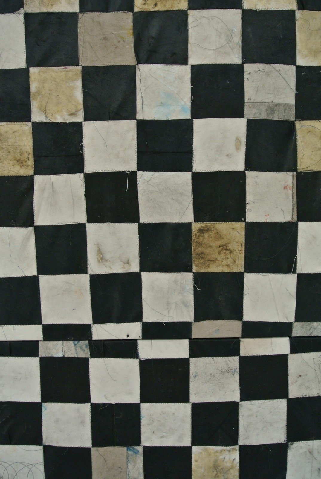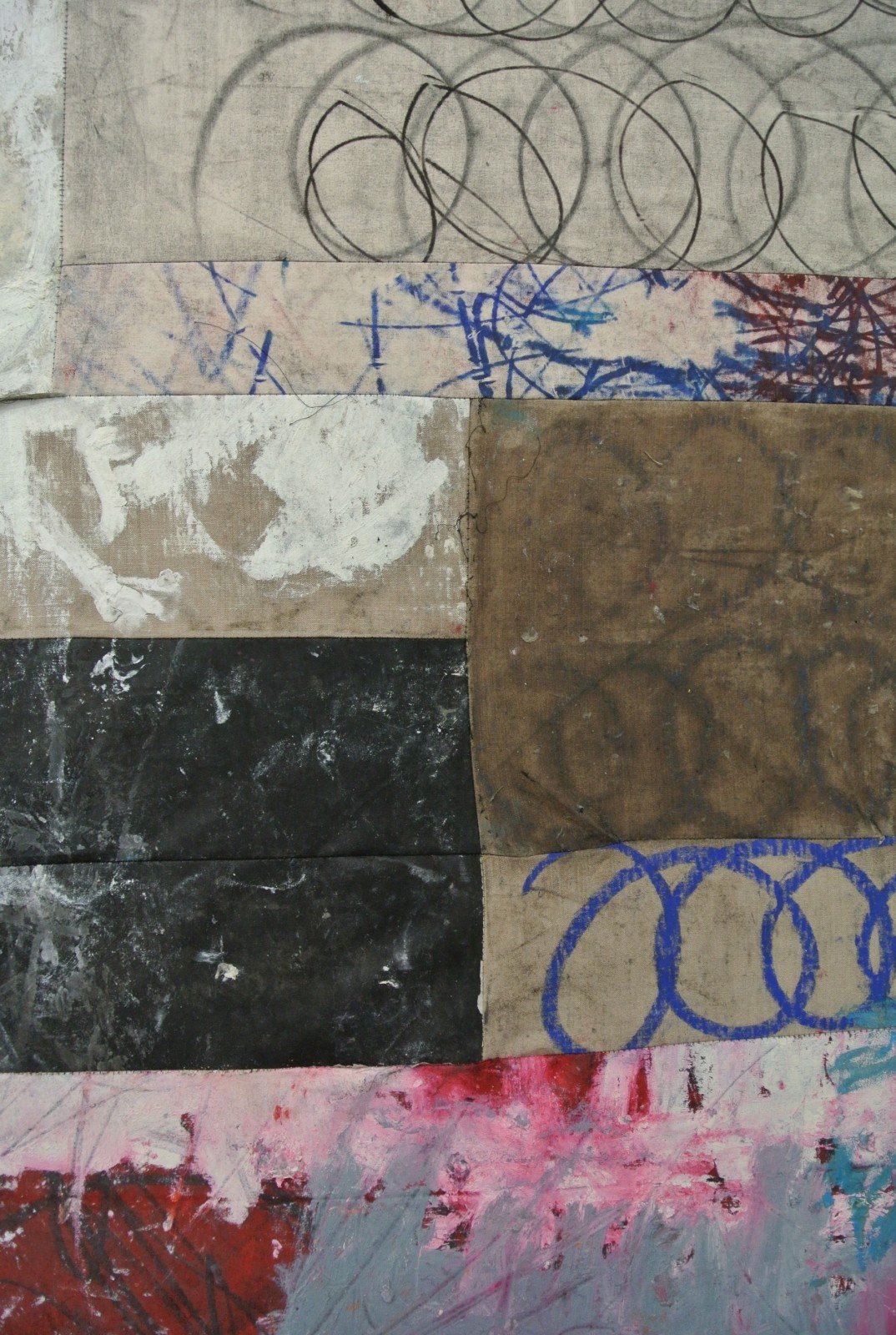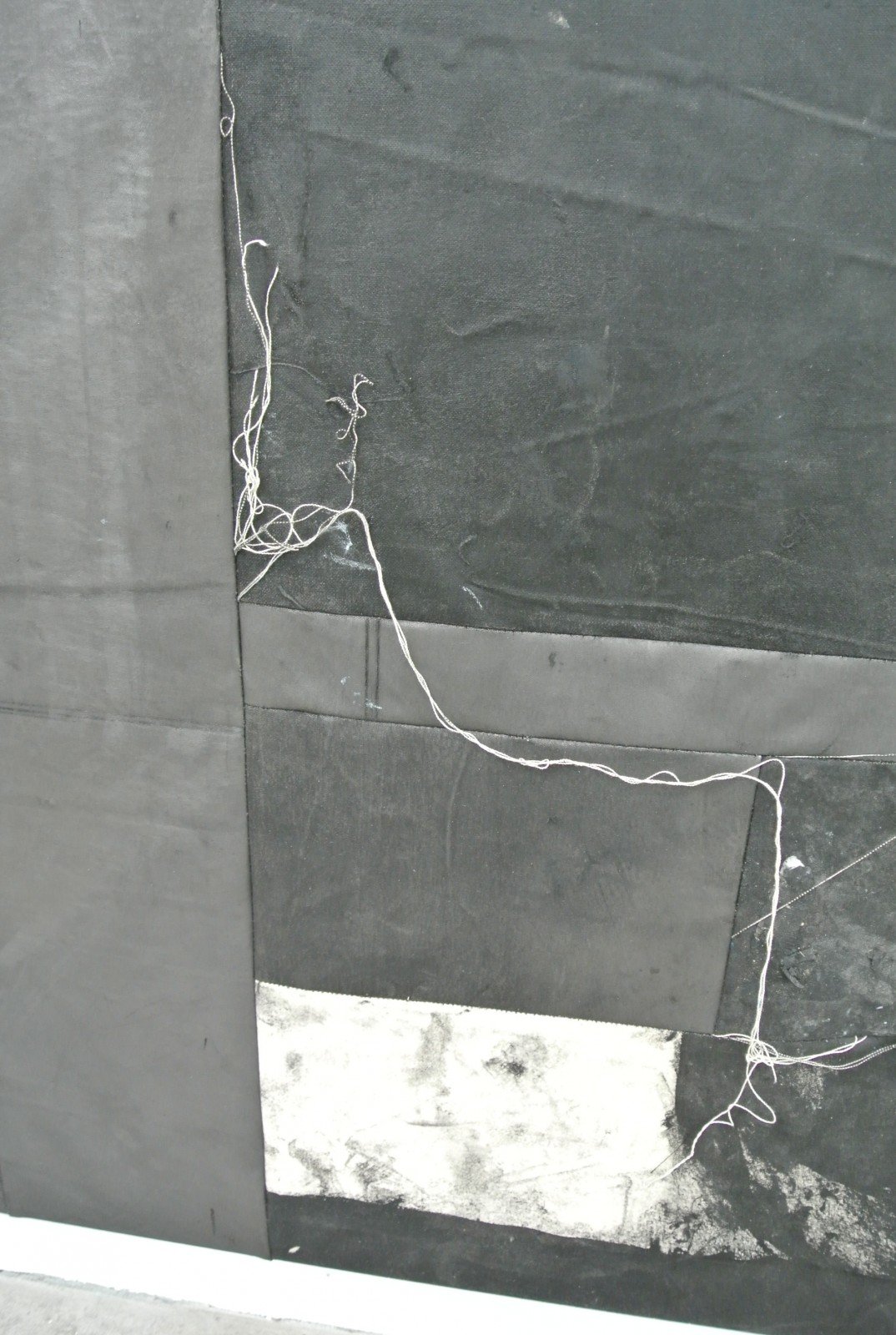 - Oscar Murillo, I (meter Sq.), 2013/2014; oil, oil stick, and thread on canvas and linen, 200 x 100 x 3,5. Detail.