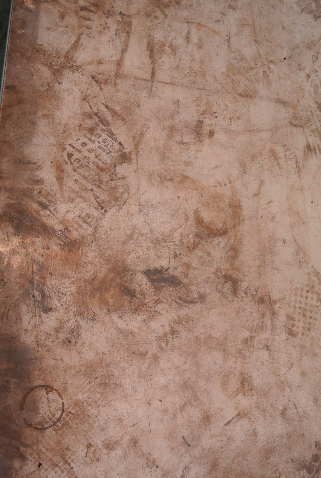 - Oscar Murillo, Workshp, 2014; 4 steel table frames, copper sheets and plywood, 800 x 101 x 74 cm. Detail.