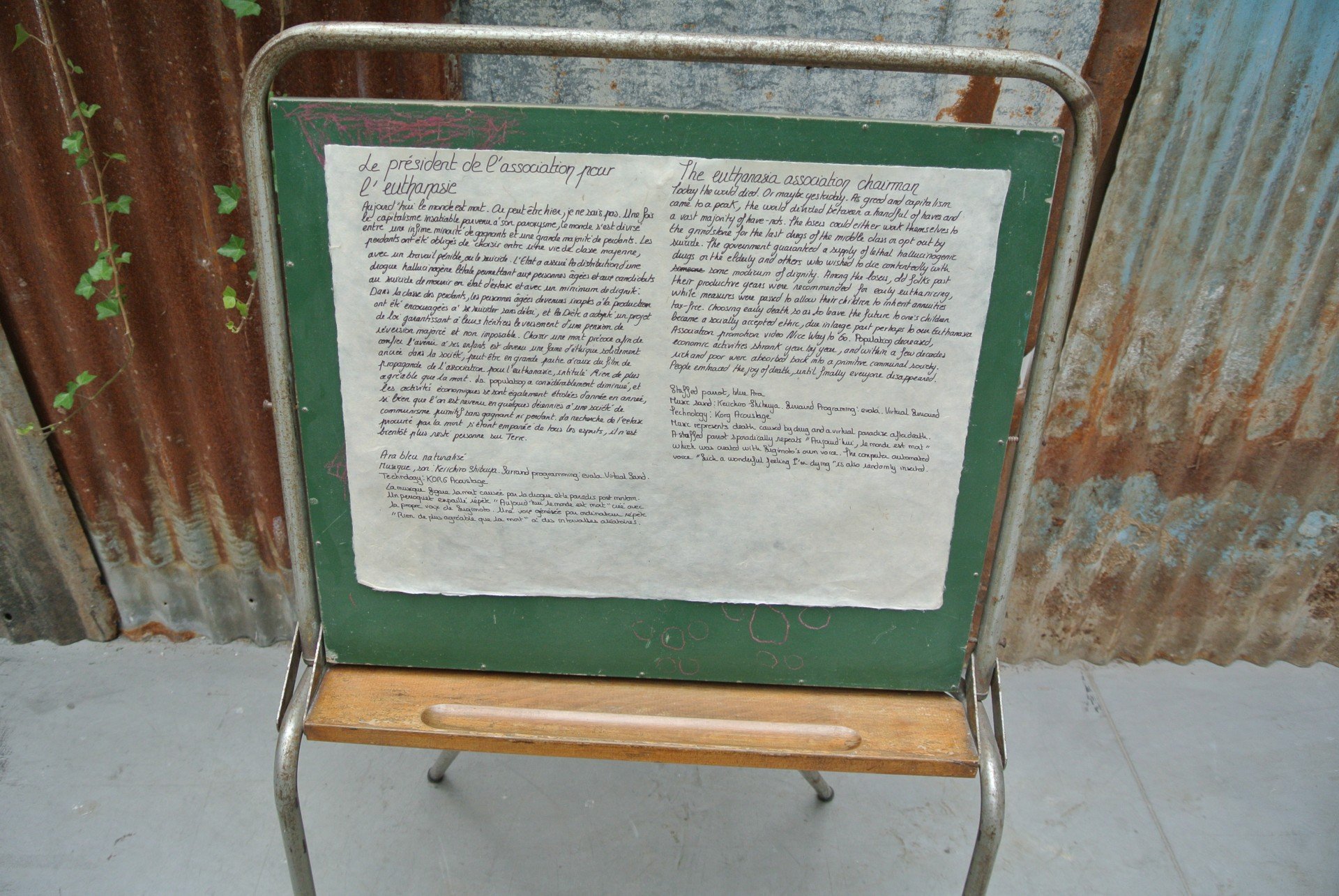 In this restricted present, the only field in which my dreams ca still unfold is the future, its form not yet being fixed. Imagining the worst conceivable tomorrows gives me tremendous pleasure at the artistic level. The darkness of the future lights up my present, and foreknowledge of a coming end guarantees my happiness in living today. In this exhibition you will find the worst scenarios created by my imagination regarding the future of humankind. It is up to the younger generations to take every possible step to prevent them from becoming a reality. Where I am concerned, I choose to give completely free rein to my intuitions as an artist. That does not mean that we should not continue to hope for the future. I leave it to the last survivor to record the actual course of the end of the world, and to preserve the genetic information of the human species, either by metamorphosing into a mummy, by preserving his genes in a test tube, or else by handing on a DNA map of his genome.