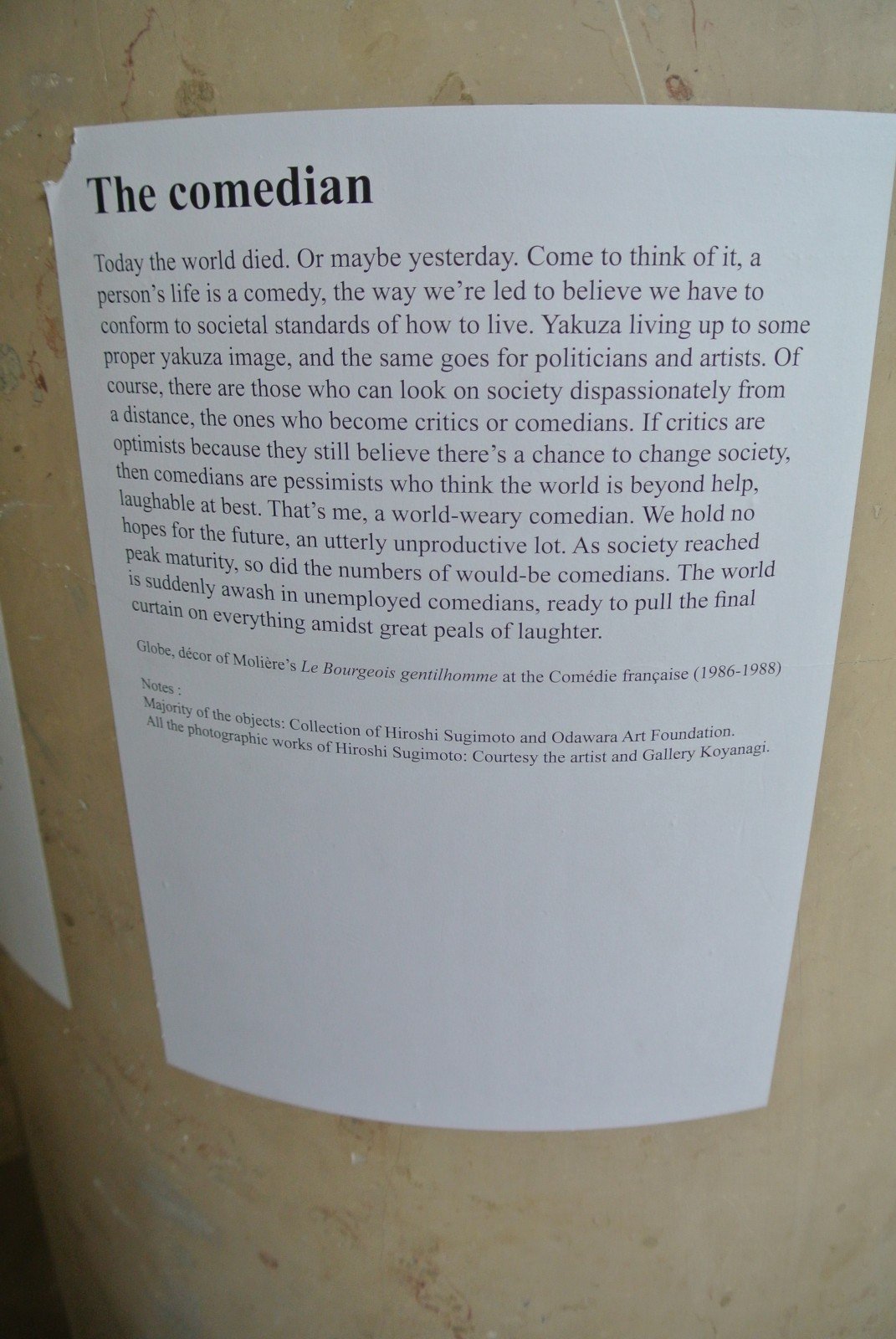 Placed at the entrance of “The world is dead (Human genetic archive)” – Hiroshi Sugimoto’s massive installation currently at the Palais de Tokyo in Paris – the text below is a keystone for the understanding of this kind of “Museum of Innocence”, which gathers together photography, writings and objects collected by the artist during his lifetime. The ambitious text, signed by the artist himself, has to be read bearing in mind that the installation it introduces has the structure of a blog: every post, thus every episode, includes a text written by Sushimoto, or by fictional characters such an astronaut or the chairman of a euthanasia society. It follows that form and information are endlessly linked one to the other.