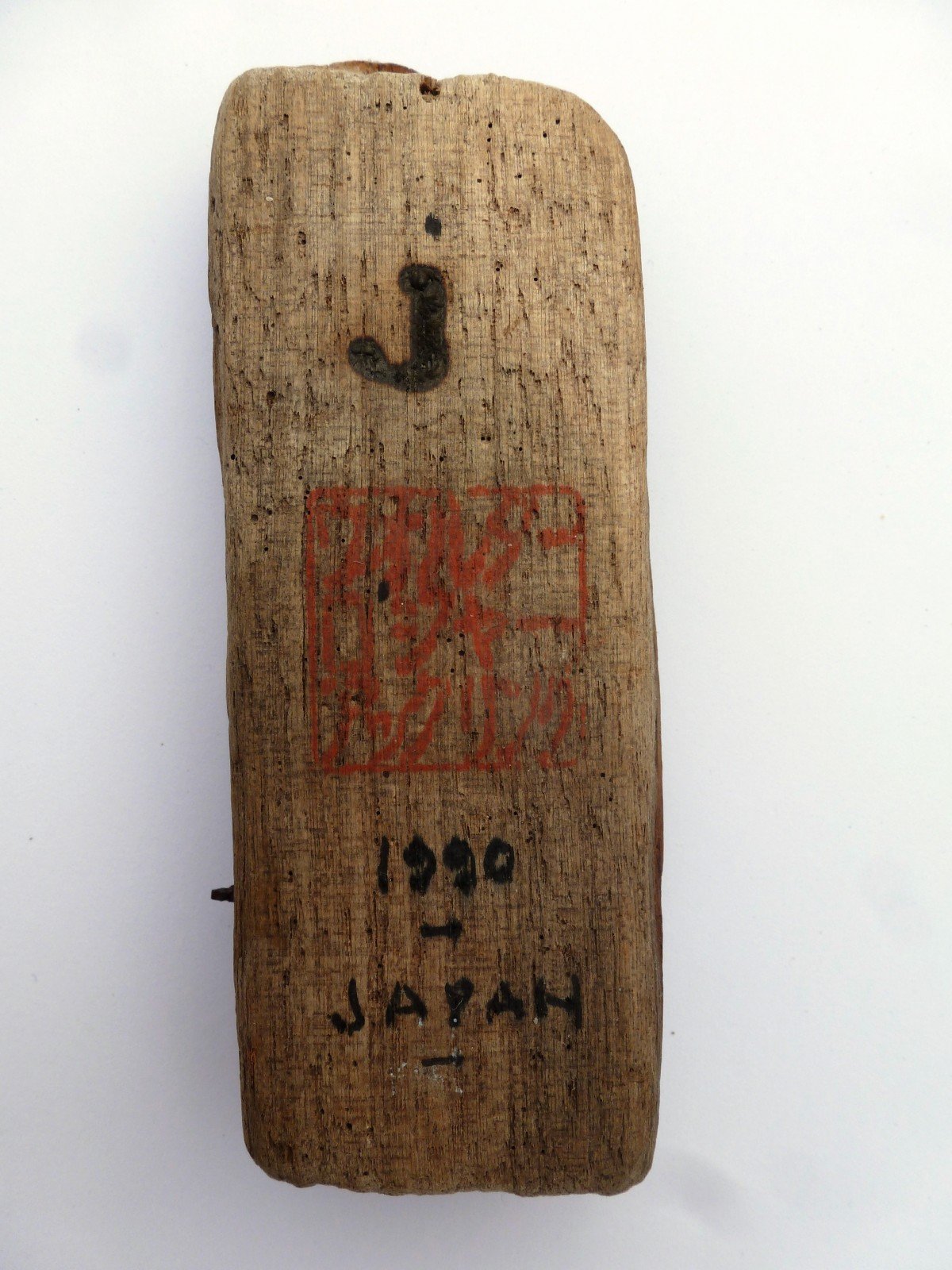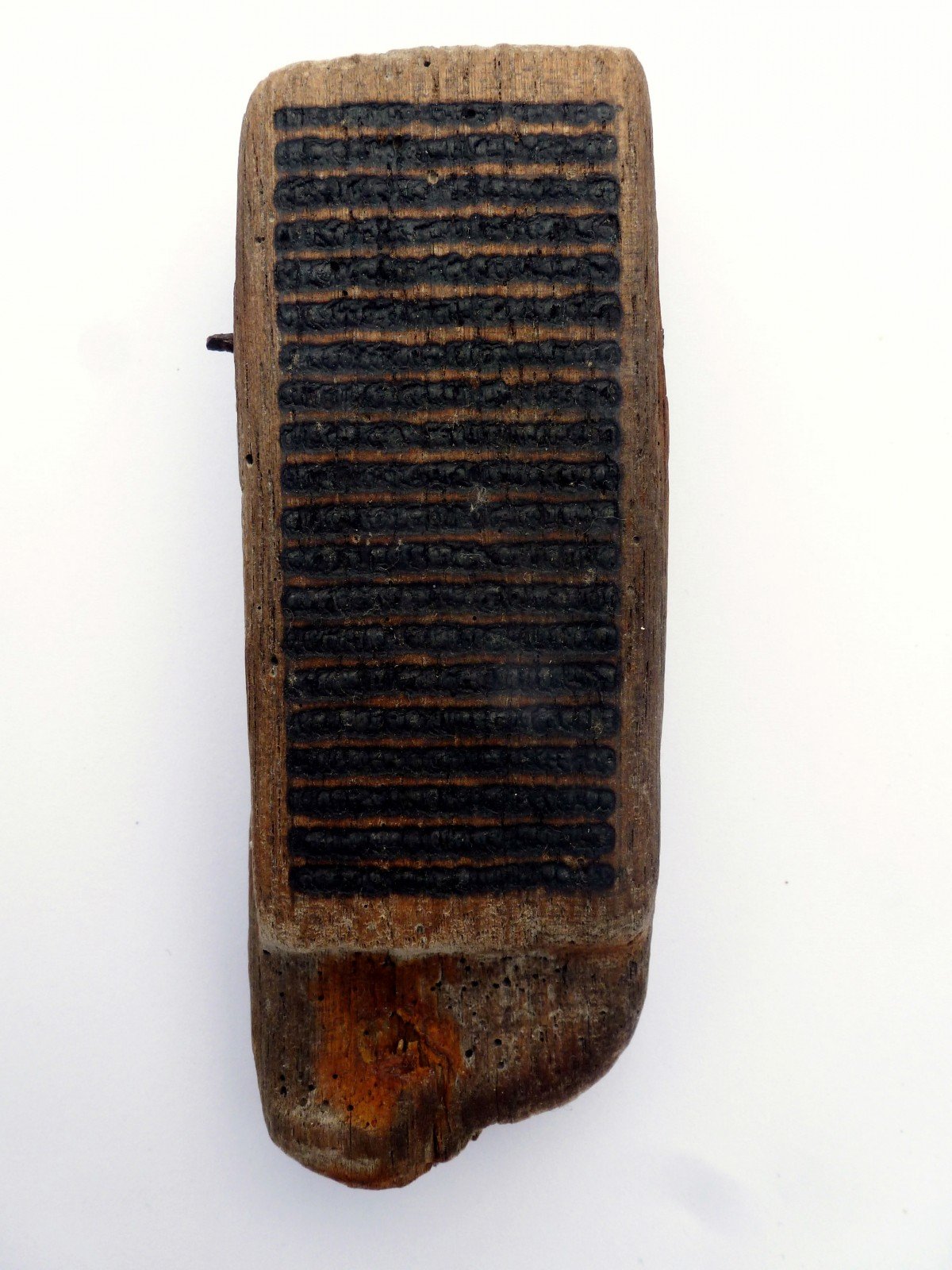 This brings us to a small treasure featured here that has the status of both ‘found object’ and work of art. It seems quite fragile as it very light and small (9X3X1cm) and is formed of a piece of driftwood that was once part of a larger structure as it had previously been cut into shape and still retains a nail that threatens to split the piece in two. Ackling collected this object from a beach in Japan in 1990. What makes this fragment of ‘jetsam’ extra interesting is that, typically, Ackling had intervened with the section of wood by burning 20 parallel lines across one surface. These lines of equal length are made by using a magnifying glass as if he were drawing, and he directed the concentrated rays of the sun onto the flammable surface over several hours. This must have demanded great patience and, perhaps, a Zen-like state of concentration.