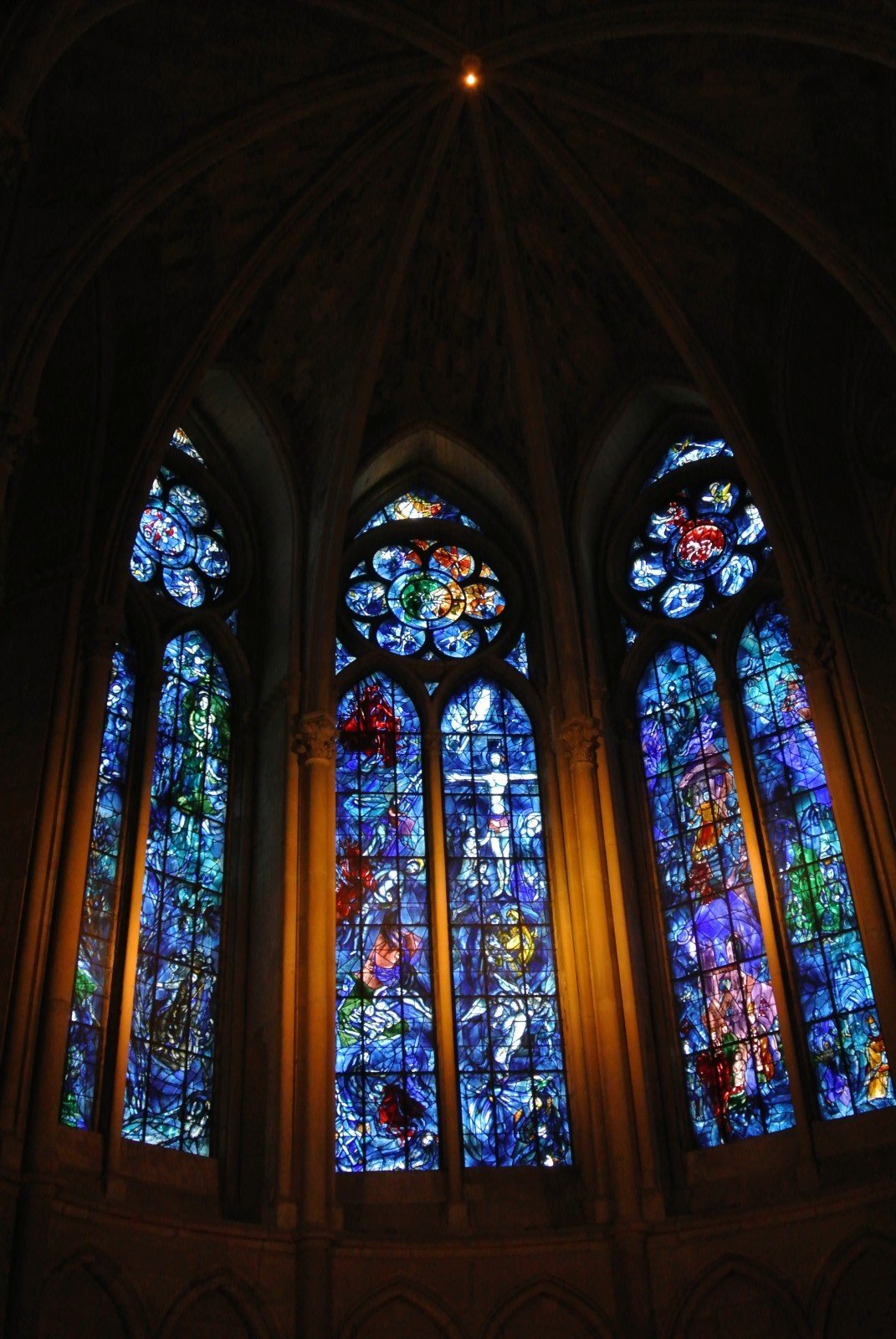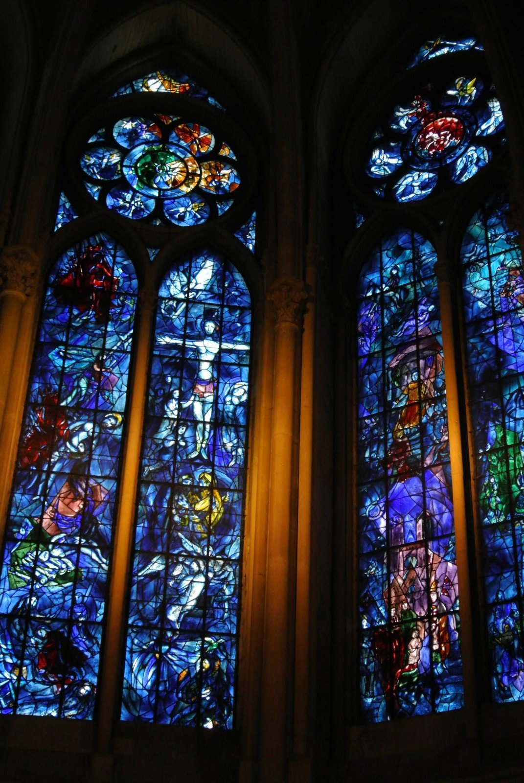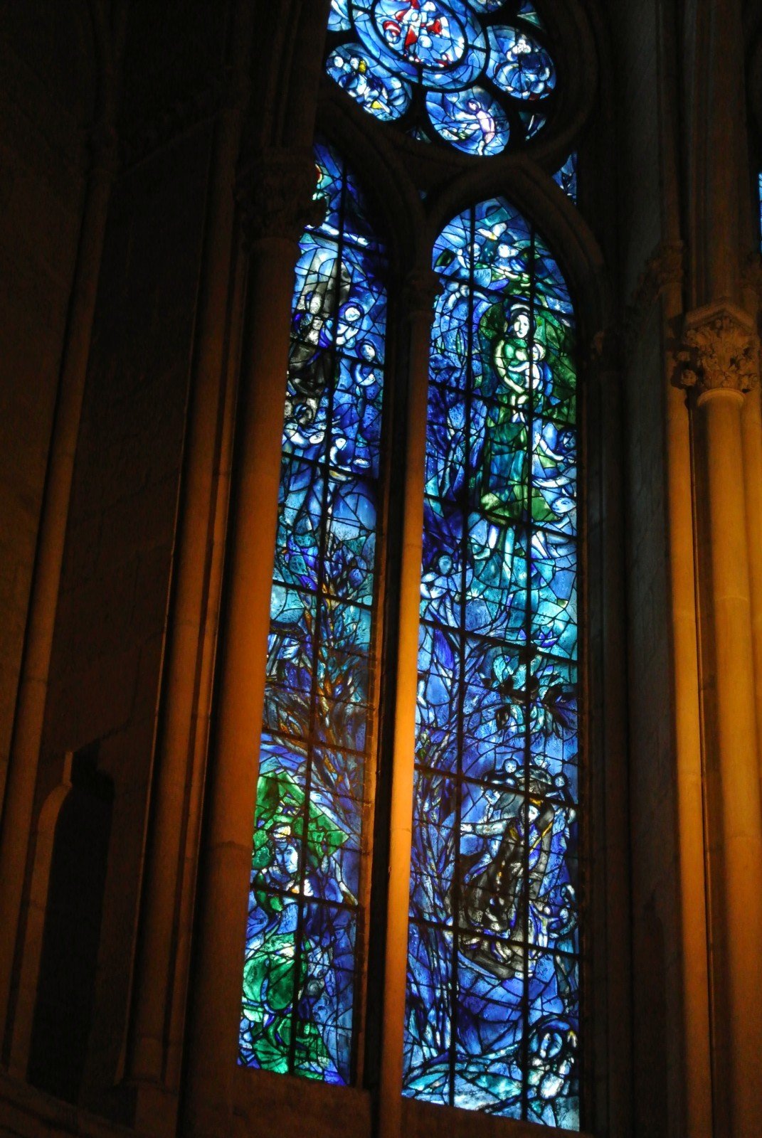 Exactly forty years before, another contemporary artist was called for a similar commission. It was Marc Chagall, who designed the glass windows for the axial chapel of the apse. In this case the program is typical of a figurative approach to the artwork.