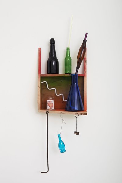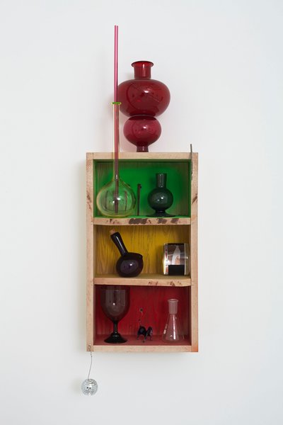 - Elias Hansen, Of course, a lot of things are sad. But not as sad as this, 2014; CFL light bulb, cork, enamel paint, found object, glass, light fixture, playing card, steel, shell, wax, wood 56 x 35 x 45 inches. Courtesy of Jonathan Viner, London.