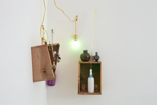- Elias Hansen, Written on the walls, writing on your grave, 2014;CFL light bulb, enamel paint, found object, glass, light fixture, playing card, silicone, steel, tape, vinyl, wood 72 x 60 x 18 inches. Courtesy of Jonathan Viner, London.