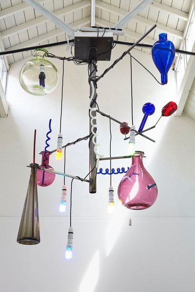 - Elias Hansen, Happy enough, I guess, 2014; CFL light bulbs, found object, glass, light fixtures, steel 54 x 64 x 72 inches. Courtesy of Jonathan Viner, London.