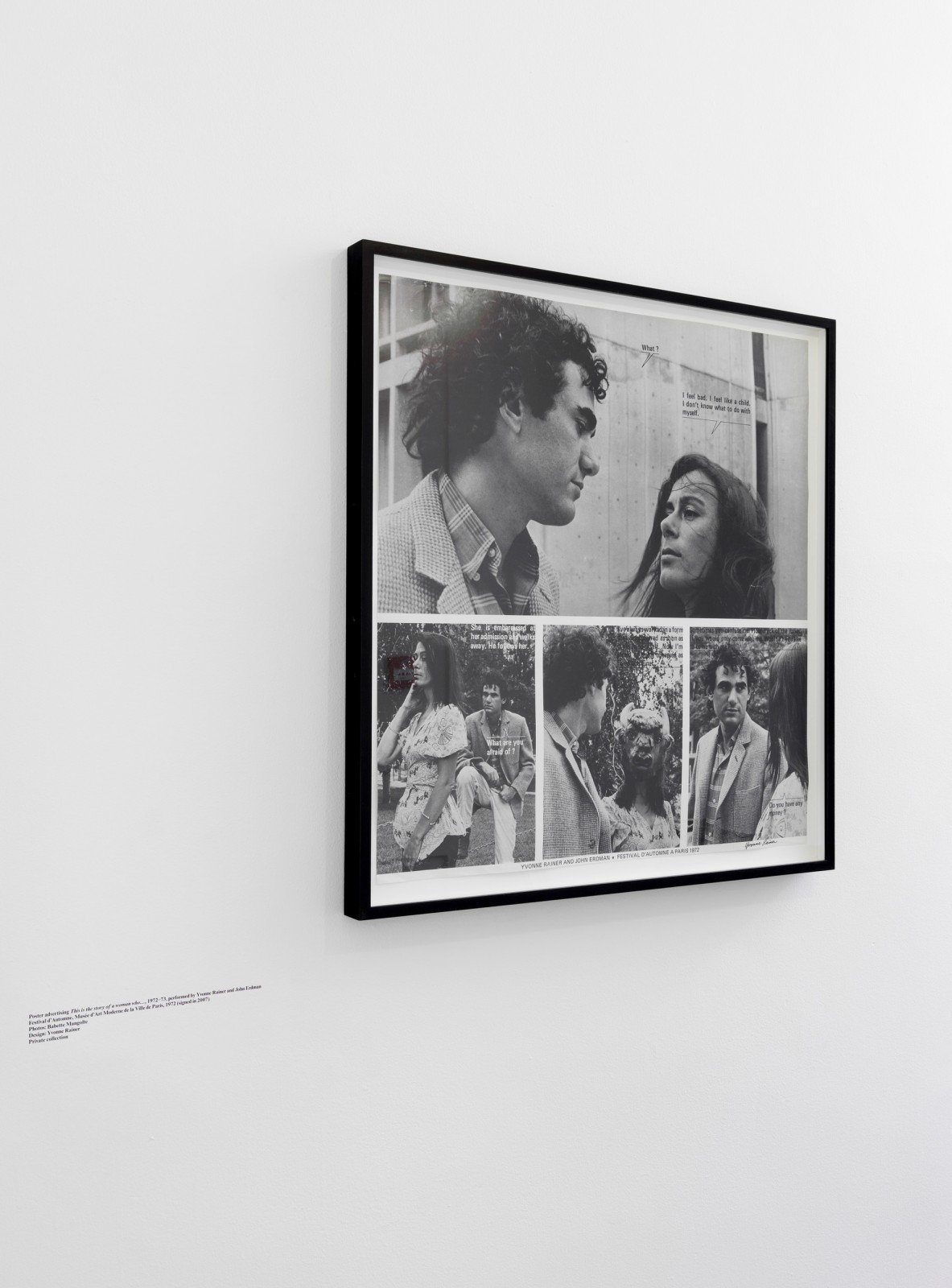 - Yvonne Rainer, Poster advertising This is the story of a woman who…, 1972–73. Performed by Yvonne Rainer and John Erdman, Festival d’Automne, Musée d’Art Moderne de la Ville de Paris, 1972. Photo: Marcus J. Leith.