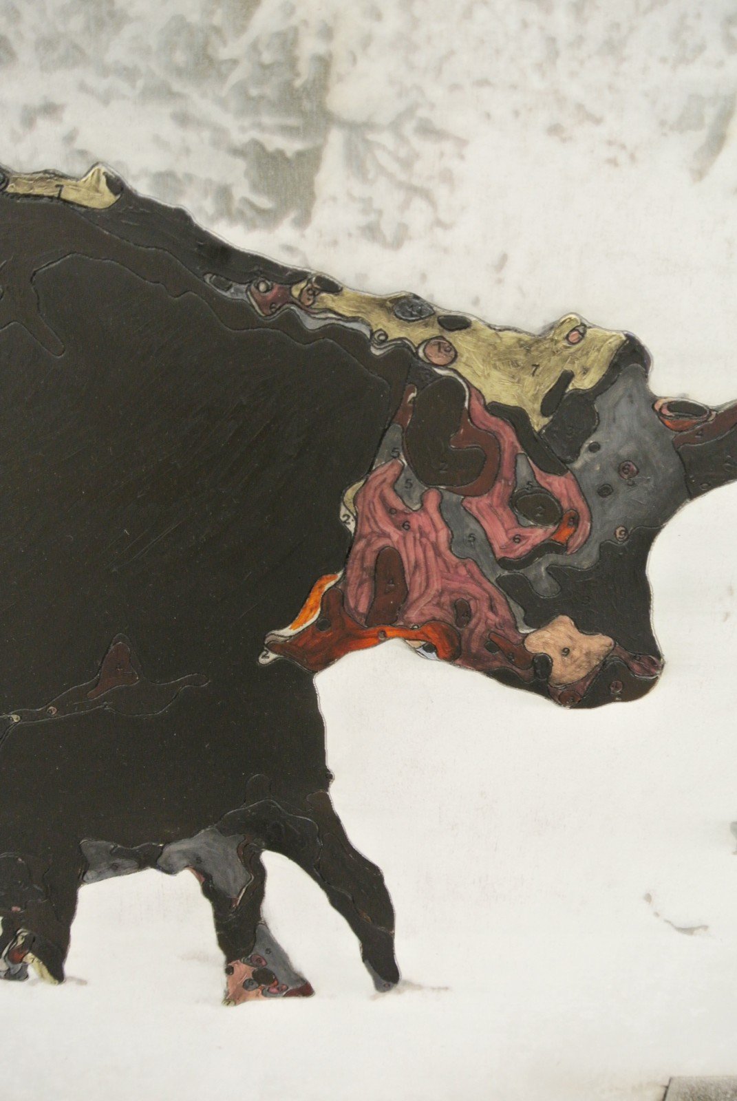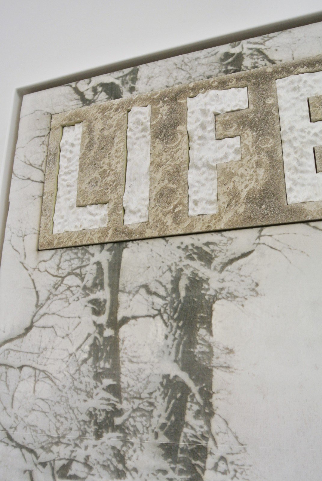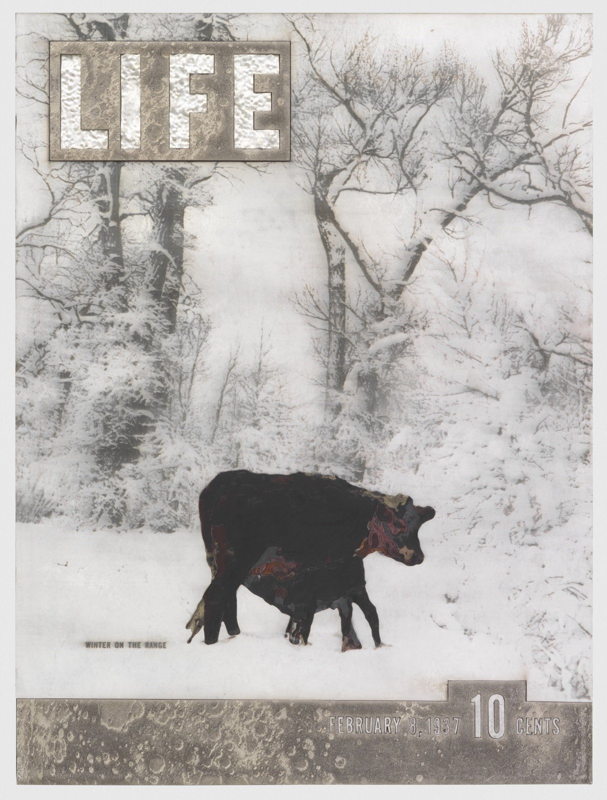 The first one is titled “LIFE, February 8, 1937”. A brief research on line will unveil that this cover of LIFE magazine re-enacted by the artist describes an extraordinary cold winter in Wyoming. The solitary cow walking in the snow is a sort of real presence in the show, and it seems to be linked, in a traditional symbolic way, to the other two pieces in the room. It could be useful to add that a feature dedicated to Nazi Hermann Goring was also in that issue, published 19 months before Hitler attacked Poland.
