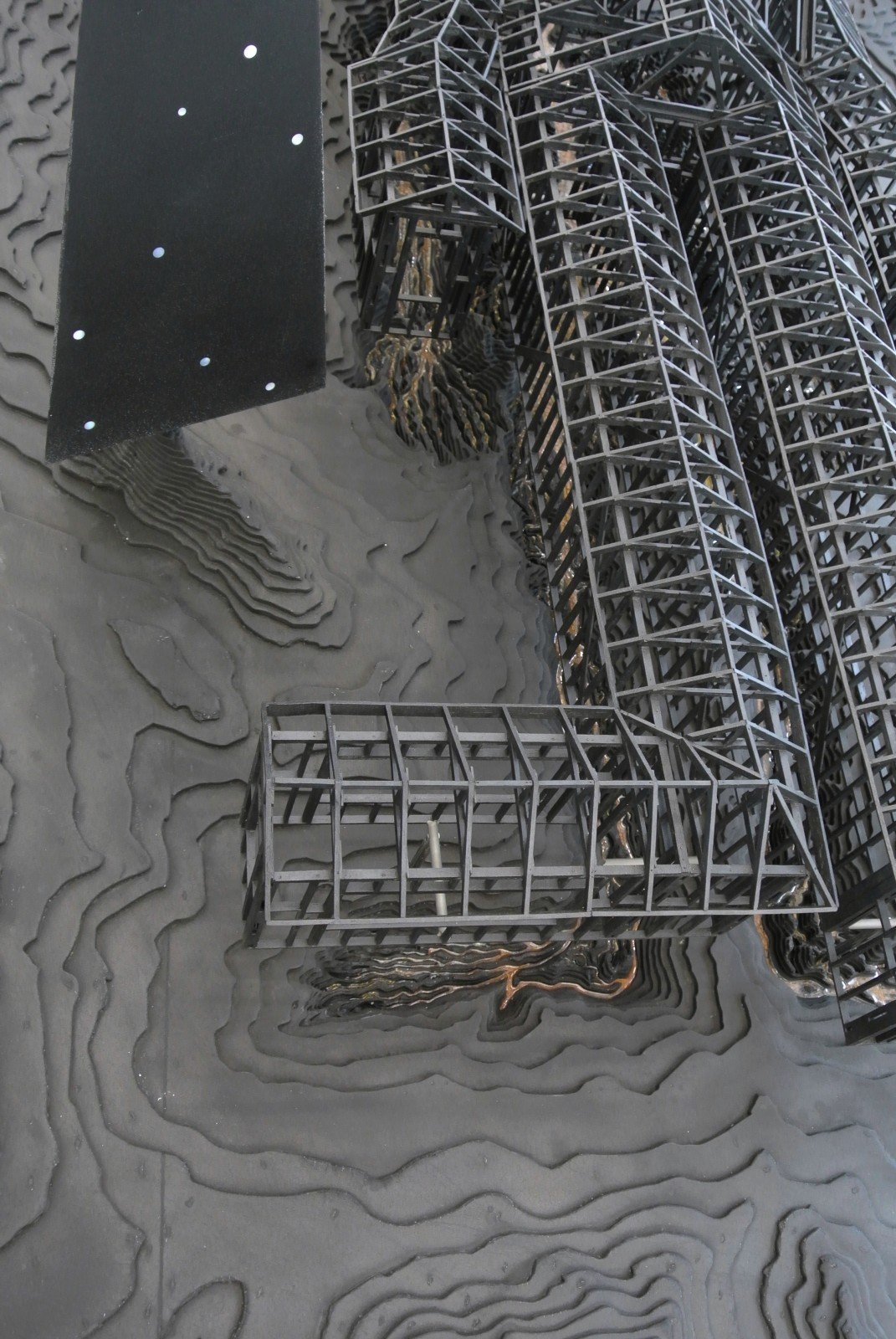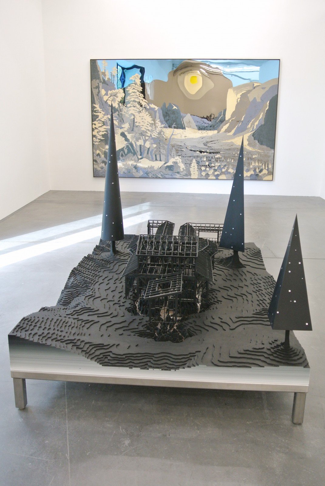 The three-dimensional piece placed beyond the LIFE’s cover is titled “Scale dilemma”. An architectonic structure, that could be either industrial or for residential use, is on the top of a canyon-like topography model. Evidently the “scale dilemma” is the one between nature and human presence. The black paint covering the model embodies a hint of pessimism, thus influencing the meaning of the beautiful two-dimensional panorama placed in front of it. “Yosemite Valley, Glacier Point Trail (after Bierstadt)” is a sort of collage of mirrored acrylic sheets in a stainless steel frame. The painting by Albert Bierstadt (1830-1902) it re-enacts – a typical romantic vision expressing the purity of nature – is in the collection of the Yale University Art Gallery. In this context it is interesting to note that the mountain guide on the bottom left side of the original painting, who is instructing his companions where to look, is not present in the replica Matthew Day Jackson has done 141 years later. The rest of the exhibition will tell you where he has gone in the meantime…