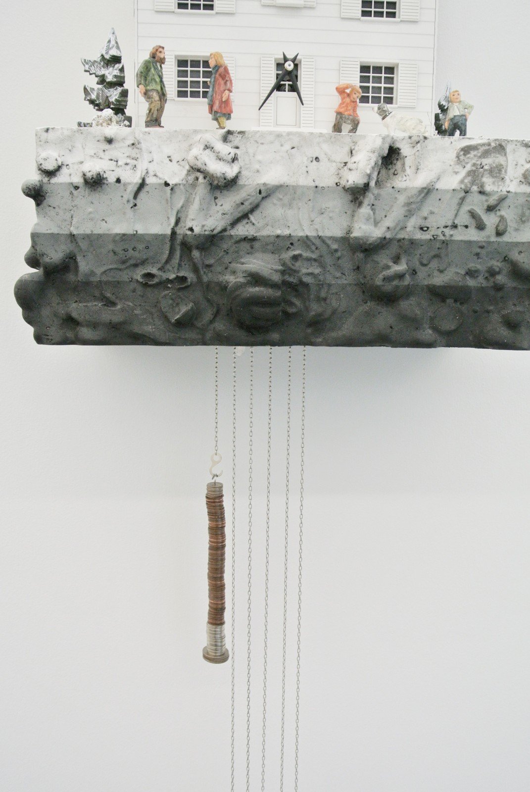 From this point of view the exhibition’s key piece is the white custom-made cuckoo clock that the beholder meets at the incipit (while the two-dimensional column telling “A brief history of the domestication of animals”, placed near the gallery entrance, seems to be a sort of exhibition’s prelude). This cuckoo clock is called “Frivolous time piece”, but this is not enough to grasp its meaning. The text available at the gallery’s desk provides the basic information. The clock is a replica of the Apple 2 house in Nevada – watch the video! – built in 1955 by the Army Corp of Engineers who wanted to discover how the average American home would fare under nuclear attack. The text also notes that prior to testing the house was dressed like a life-sized doll-house. “Mannequins, food, linens, and home décor were shipped to the testing site to create a more realistic destruction of the home as well as demonstrating the roles in the narrative of American life in the1950s”. At this point the visitor doesn’t need to read more to realize that the characters on the scene are indeed the artist himself, his wife, their two kids and their dog. The clock plays “Enola Gay”, by OMD, and “Winter Wonderland”, at quarter past and quarter to the hour.