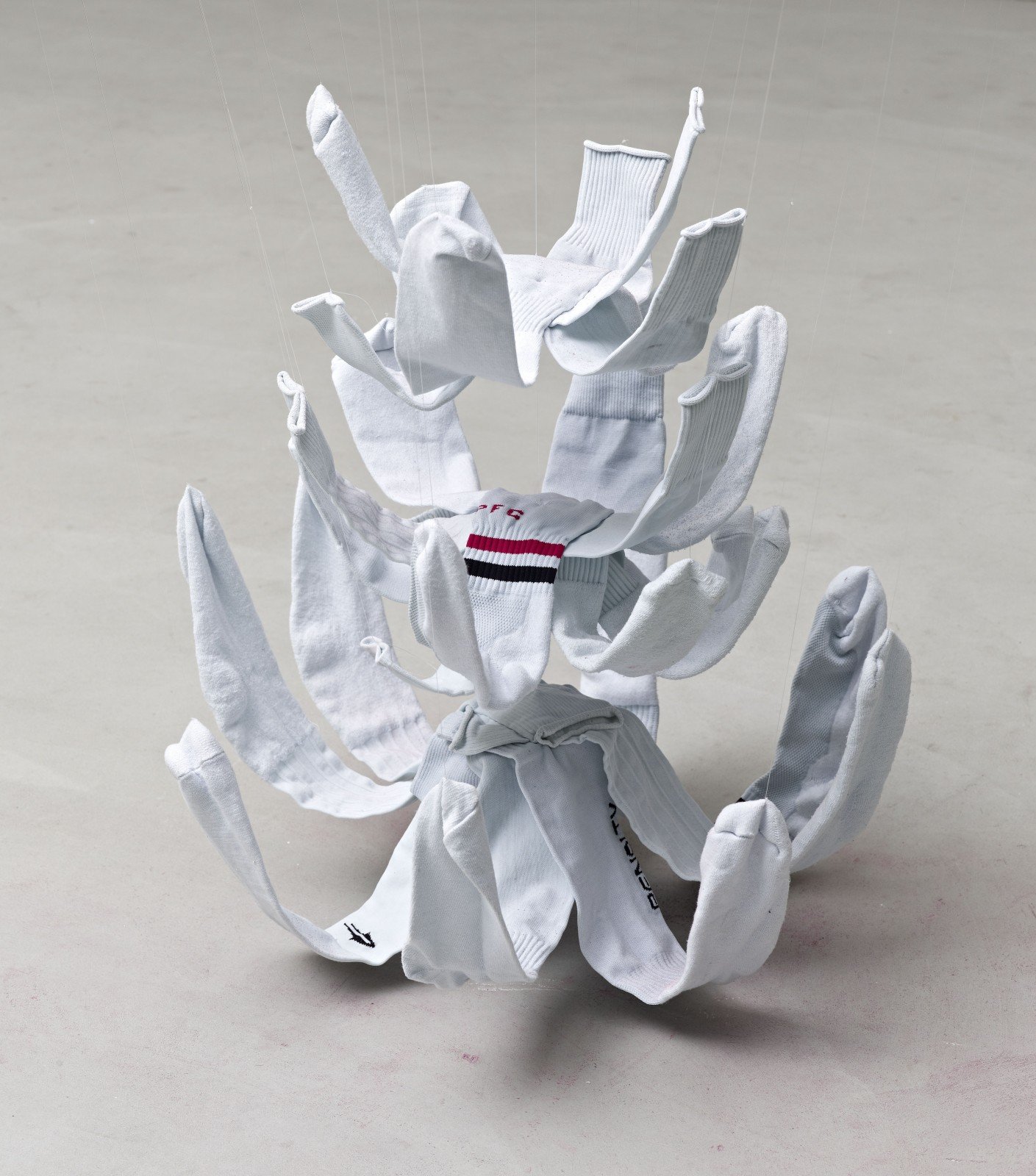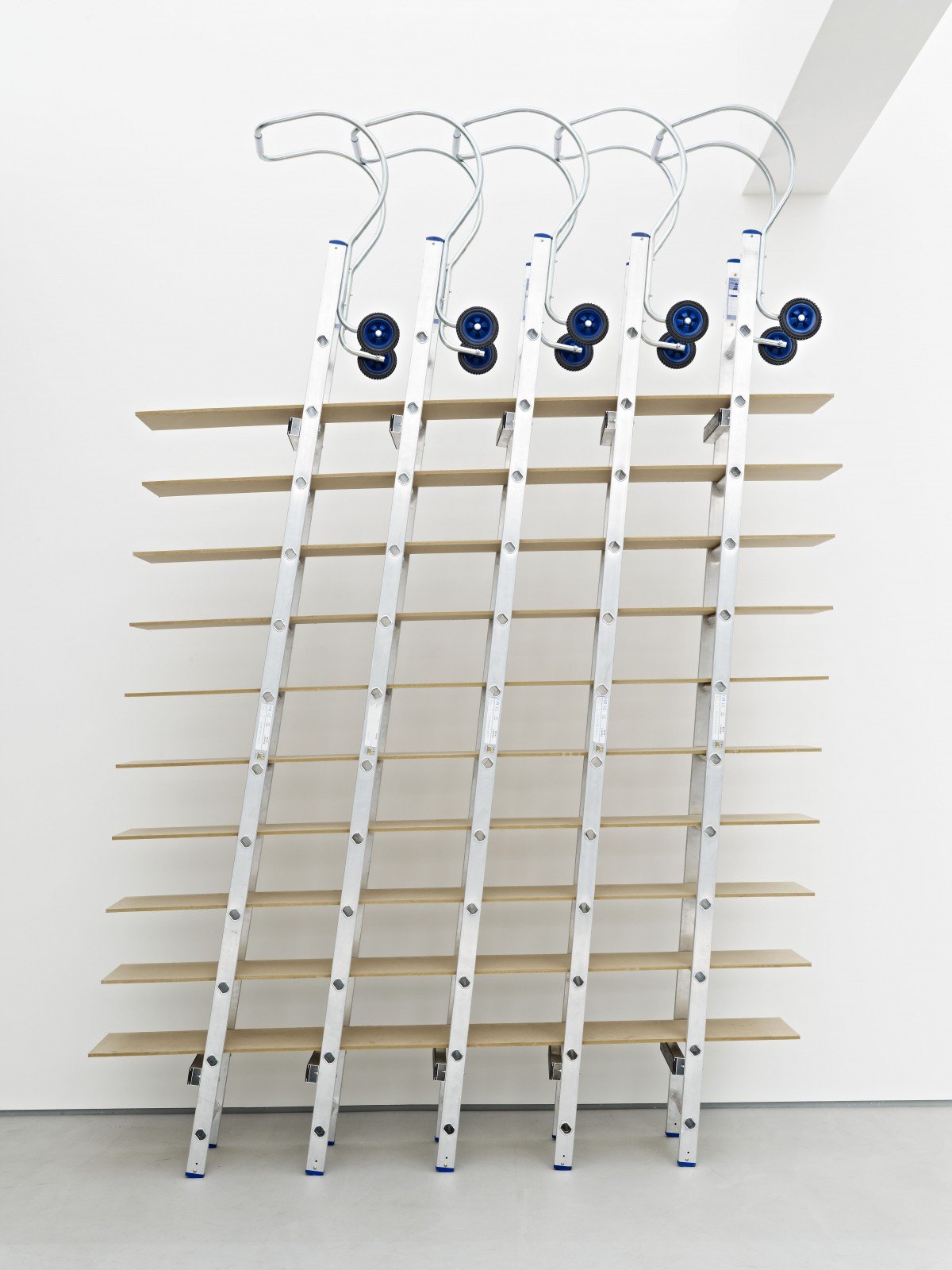 Fashioning art out of the materials that constitute the piecemeal world around us, Adriano Costa blurs the boundary between painting, sculpture-in-the-round and installation art, leaving categorization for the historians, as the artist collects, selects, makes, produces and presents his findings with a sense of ease and playfulness. He forms a material and conceptual language from objects and their arrangements and proximity to life. The signs and meanings, or perhaps matter-of-fact stories of the everyday, rather than anything too high-brow, suggests that Costa’s work is, in poetic terms, more Imagist than Surreal (London), and more metaphorical than documented (Milan). There is lateral thinking too, as a collection of white socks forms an organic structure in ‘Lotus’, or, in ‘Bartira – Suggestion for Furniture’, five ladders are transformed into a shelving unit that might be poking fun at the notion that our creativity is undermined by the availability of the contemporary ready-made artefacts that fill the marketplace. This is an aspect of Costa’s work that strongly remind us of Campana brothers’ design practice.