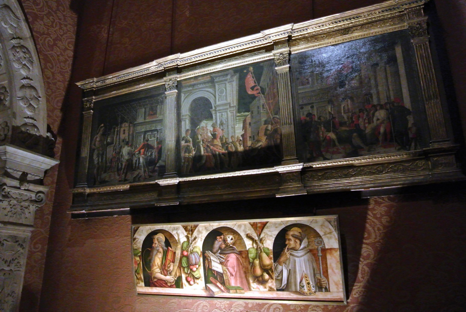- On the top: Andrea Mantegna (attributed to), Episodes from the life of Saint Christopher, XV cent. On the bottom: Carlo Crivelli, Saint Paul, Saint Augustine, Saint Bruno, 1493.