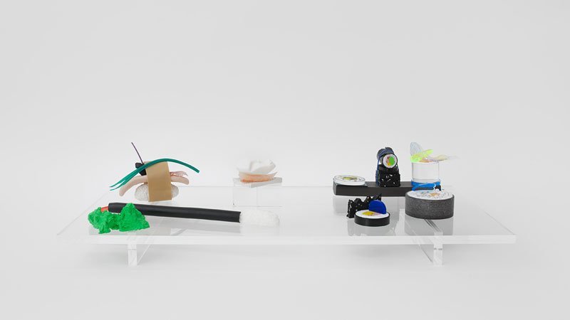 - Strauss Bourque-LaFrance, “Sushi for Scene Six,” 2014, rubber tubing, plexiglas, clay, Dove soap, sculpy, composite rubber, plastic rice, plastic shrimp, 24 x 12 x 6 inches. Courtesy of Rachel Uffner Gallery.