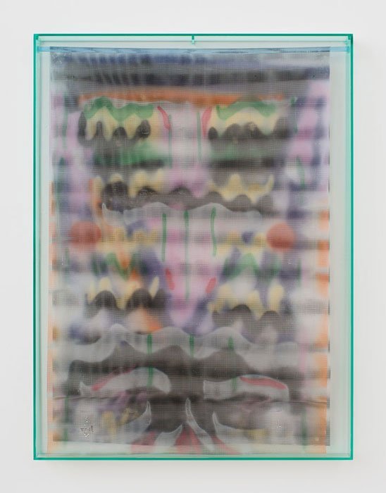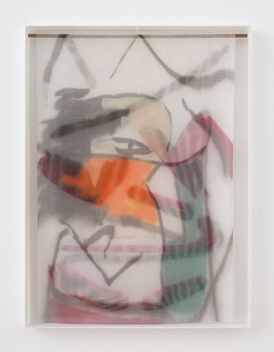 - Strauss Bourque-LaFrance, “Bait and Switch,” 2014, plexiglas, plastic mesh and spray enamel, 40 x 30 x 2.25 inches. Courtesy of Rachel Uffner Gallery,