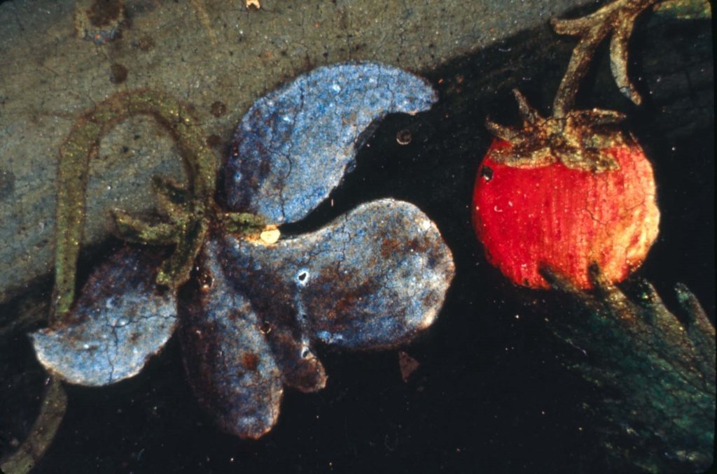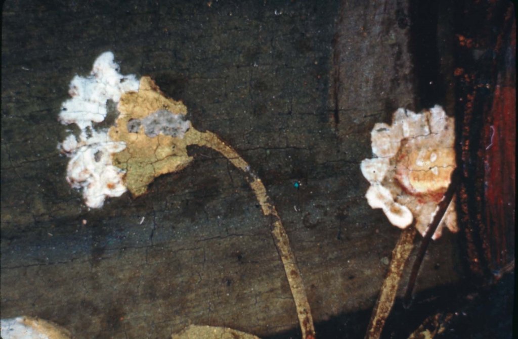 At the backside of the Virgin, beyond a sheltering screen of fruit trees is an hypnotic hill, painted through a sort of “fish-eye” lens and covered with cultivated fields, fortified towns, stony roads, and a certain number of nude, pointed mountains. Nevertheless the painting is clearly lyrical, with all its volumes moving harmoniously and the colour palette set to make the fruits and flowers emerging from the background like if they were precious jewels offered to the mother and the baby.