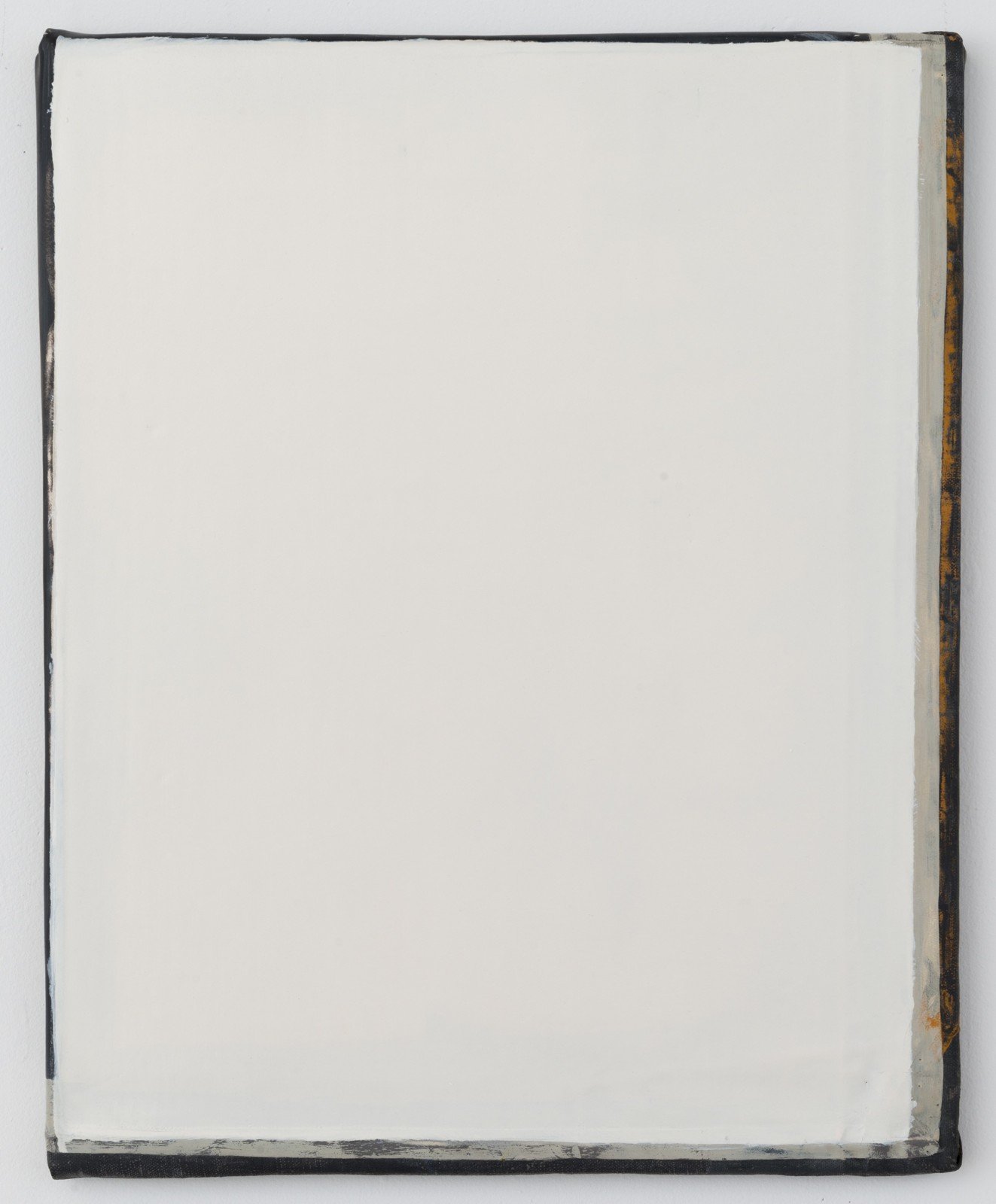 Her technical process normally begins with applying a monochrome layer of colour on the canvas, which can then be mounted on different wooden frames once it has dried or slightly moved in different positions on the stretcher, leaving at times extra material that needs to be wrapped around the edges. More colours are then applied and further canvas shifts are made in circles of work that eventually stop, leading to the final appearance of the painting.