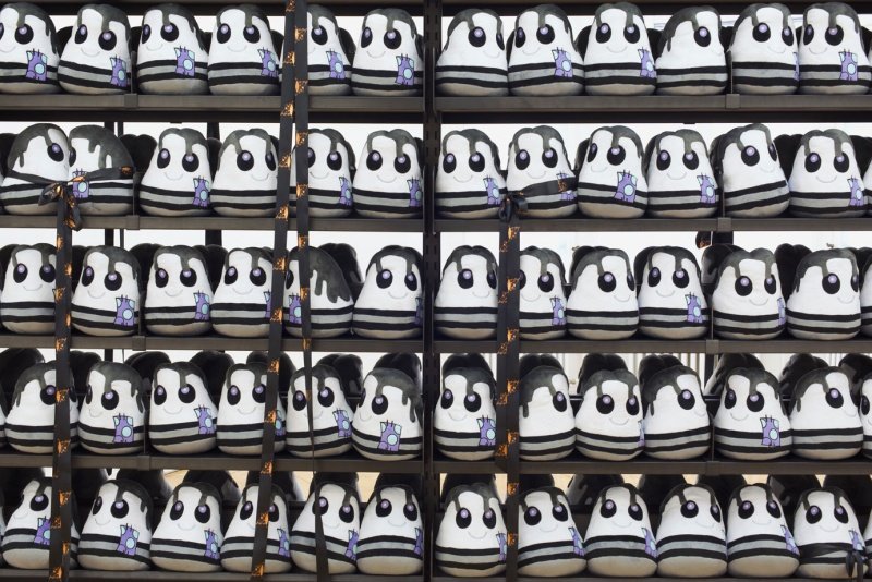 - Bunny Rogers, lone State Bookcase, 2014 (detail). Maple wood, metal, Limited-Edition Elliott Smith plush dolls, “Ferdinand the Bull” third-place mourning ribbons, casters; 246 x 309 x 61 cm / 97 x 121.5 x 24 inches. Courtesy of Société Berlin.